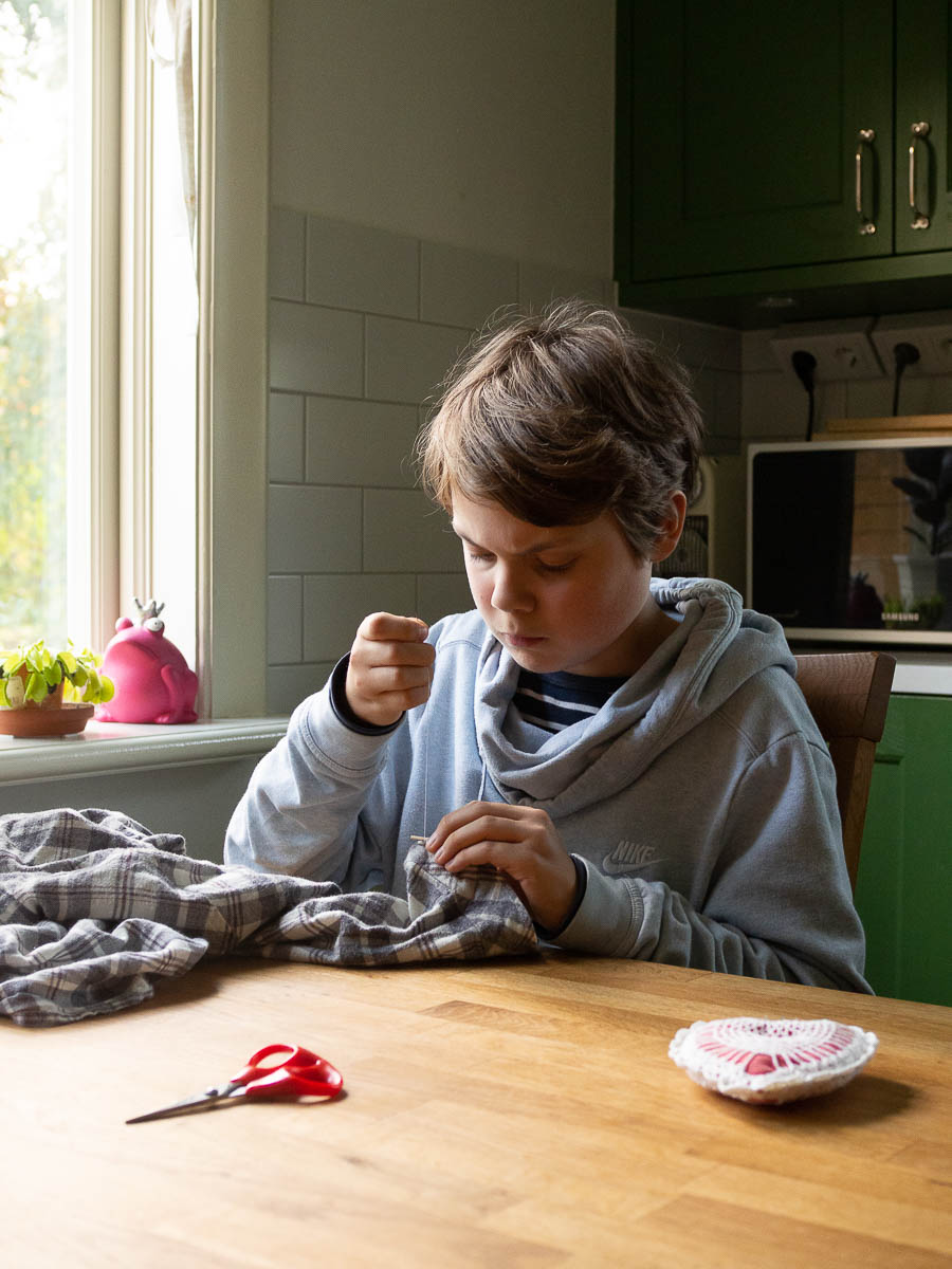 All this mending reminded Adrian that he had a list of homework tasks from his home economics class, one of which was to mend a small hole or sew on a button. My backlog of mending was now empty – except for a shirt waiting for a sleeve button to be re-sewn! He came just in time; had he mentioned the homework an hour later, I wouldn’t have had anything for him. I guess we could always cut off a button and reattach it, but it would have felt like a waste.