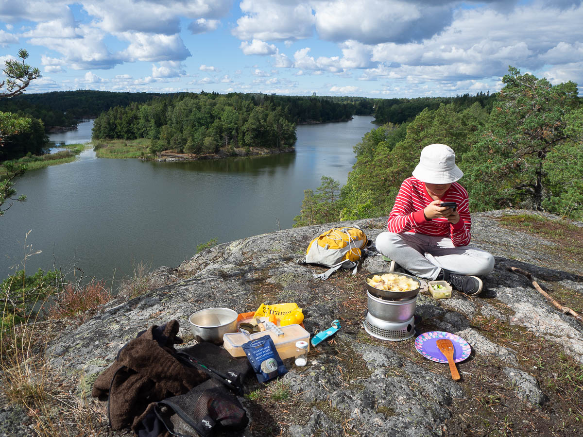 We found a nice clifftop spot for our lunch, with wide views over Albysjön. Halfway through our meal we got a tiny bit of rain – just enough to make Adrian seek shelter under a pine tree, and to get everything slightly wet, but luckily no more than that.