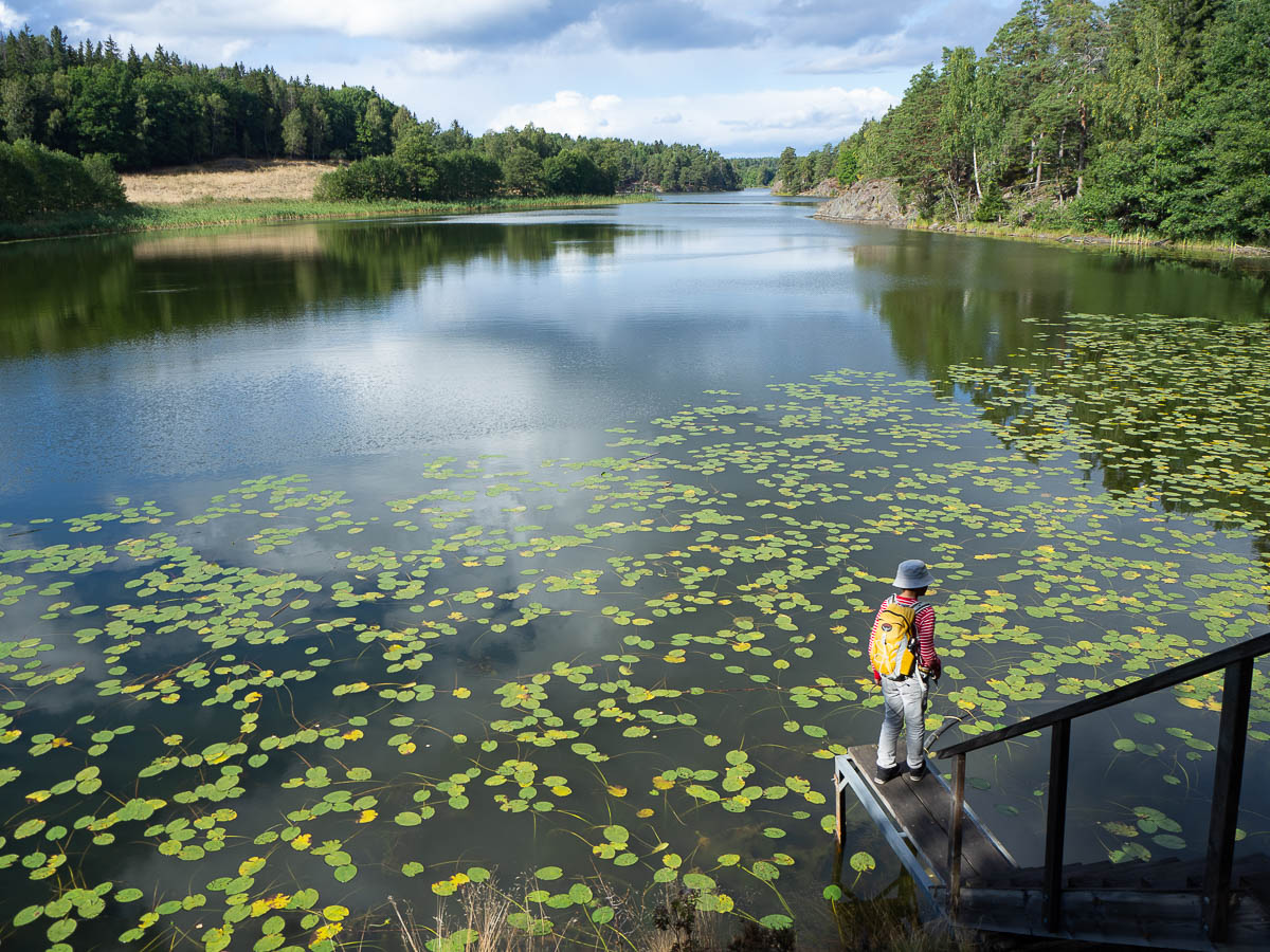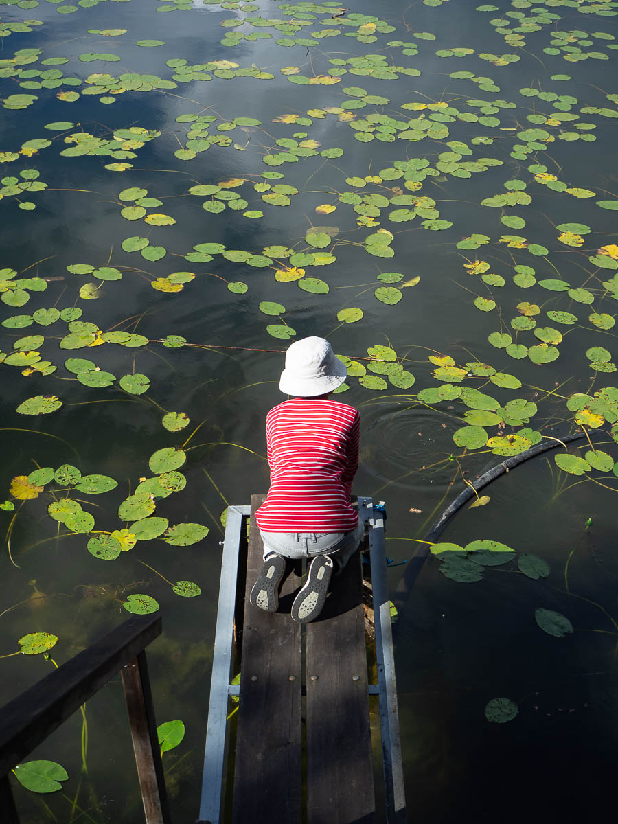 With just the two of us, we could take breaks whenever we wanted for whatever reason – such as finding a small jetty in the middle of a profusion of water lily leaves, which Adrian could throw pine cones at.