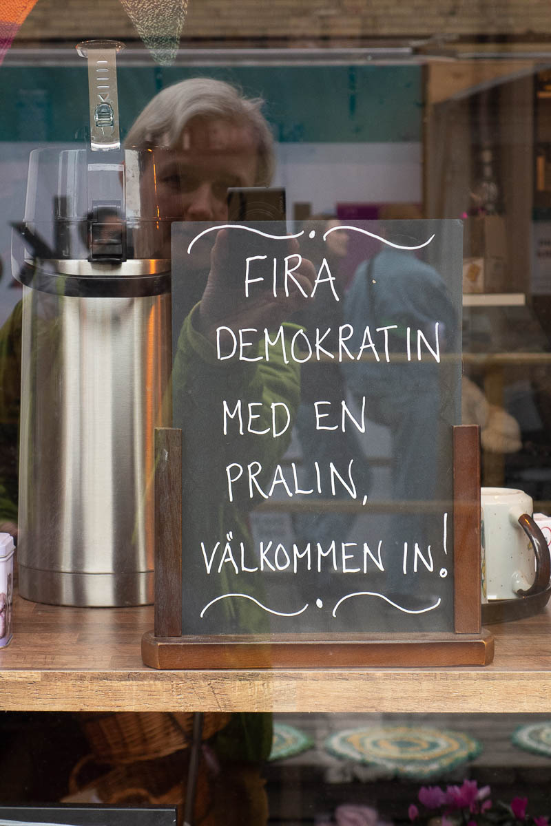 The café next to the advance voting station was urging us to “celebrate democracy with a praline”. This was cheeky enough to work, so Adrian and I bought fancy pralines for ourselves.