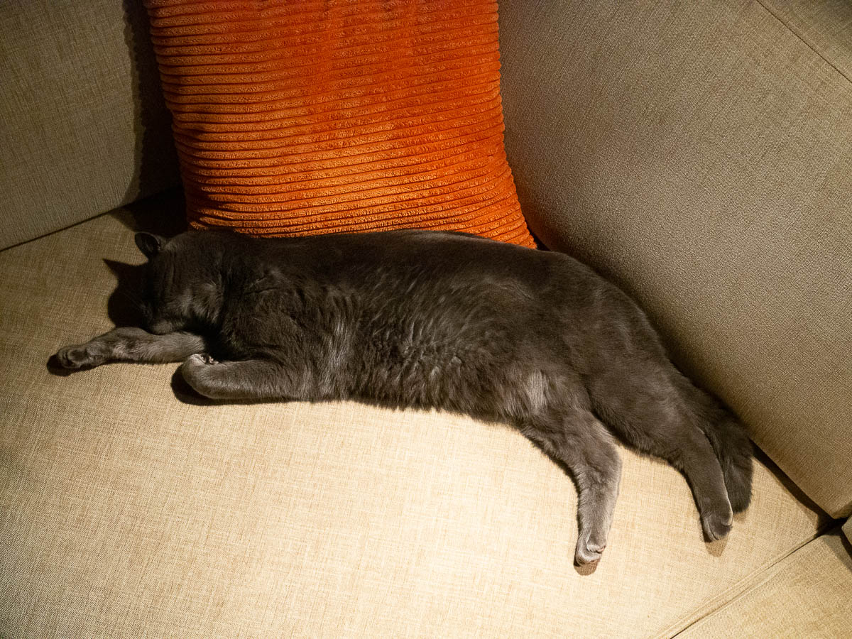 When I got up for real an hour later, he had finally come home and gotten breakfast. He was extra cuddly all day, spending hours sleeping in my lap. Even to the point that, when I removed him so that I could stand up and go to the kitchen for lunch, he followed me and jumped up in my lap again. Usually he just gets annoyed with us when we move him while he’s sleeping, and goes away to find a better place to sleep. “I didn’t want to be with you guys anyway if you’re going to be behaving like that.” It makes me think that perhaps he did actually get lost again, and was happy and relieved to find his way home to us. I wonder where he went.