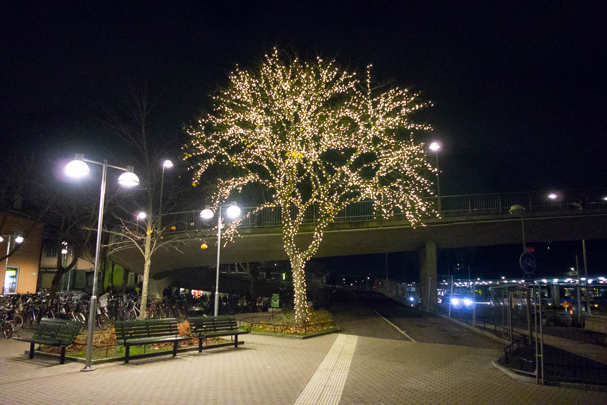 The Christmas lights at Spånga Torg are up. We’ve gotten new lights this year – there used to be spirals of lights around a few of the trees, but they were purple, and only wound around the largest branches. Now it’s like they’ve wound the strings around every single twig. Looks very impressive, and brightens things up very nicely. It must have been a tricky job.