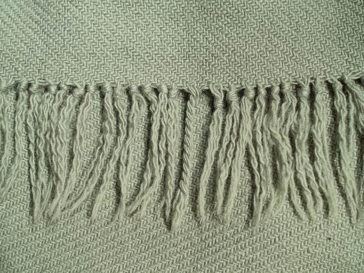 The blanket has a fringe, which started out as twisted yarn. With time, the twist has gone out of most of the fringe. I’ve tied knots in the loose fringes, as and when I’ve spotted them, to keep them from unravelling completely. Now there are just a very few of the original twists left.