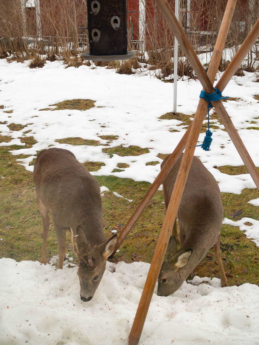 The deer are cleaning up after the birds, eating spilled seeds. Surprisingly unbothered by me standing two metres away with a camera. I guess they’ve learned that humans can’t walk through walls.