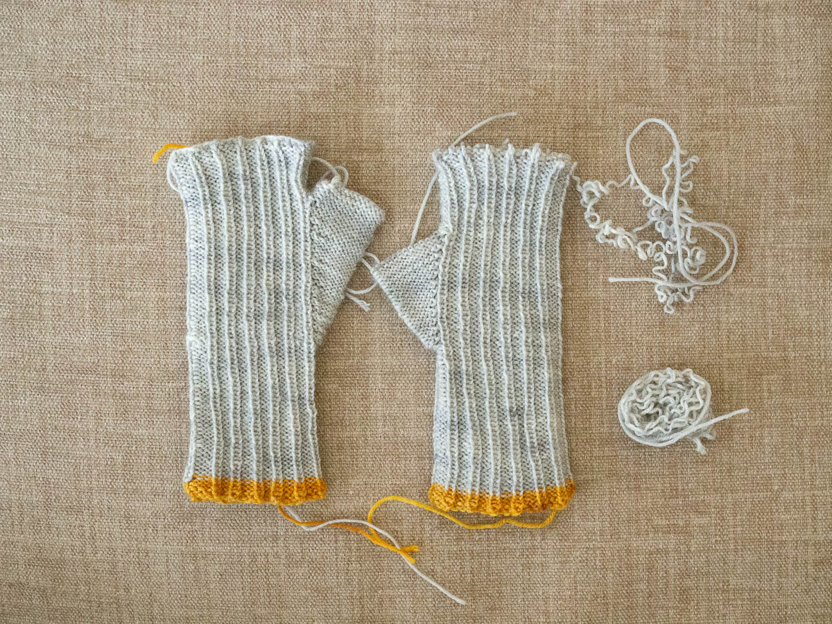 So it’s back to that most common of knitting techniques: ripping it all up and redoing it. The glove on the left is my second, better fitting attempt; the one on the right I just started ripping up.