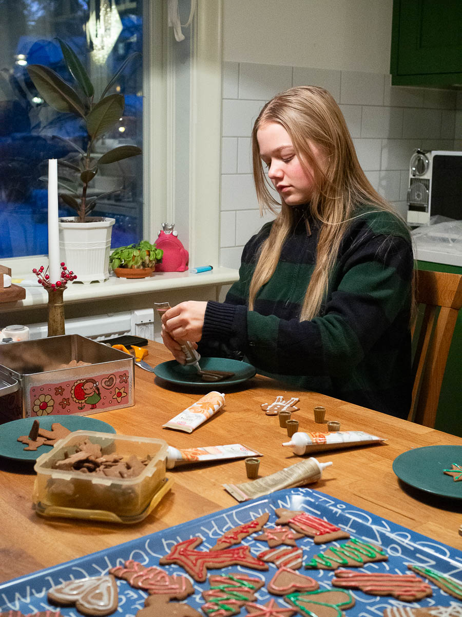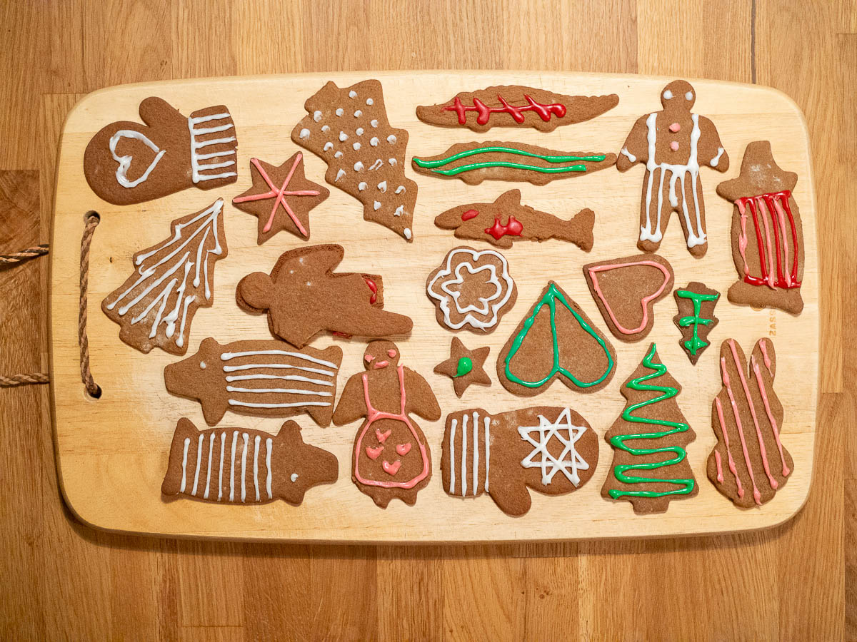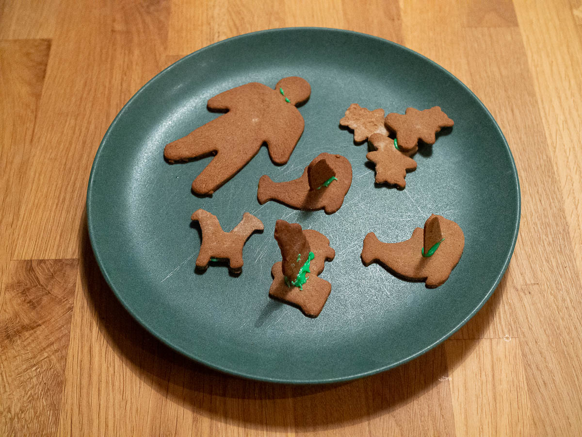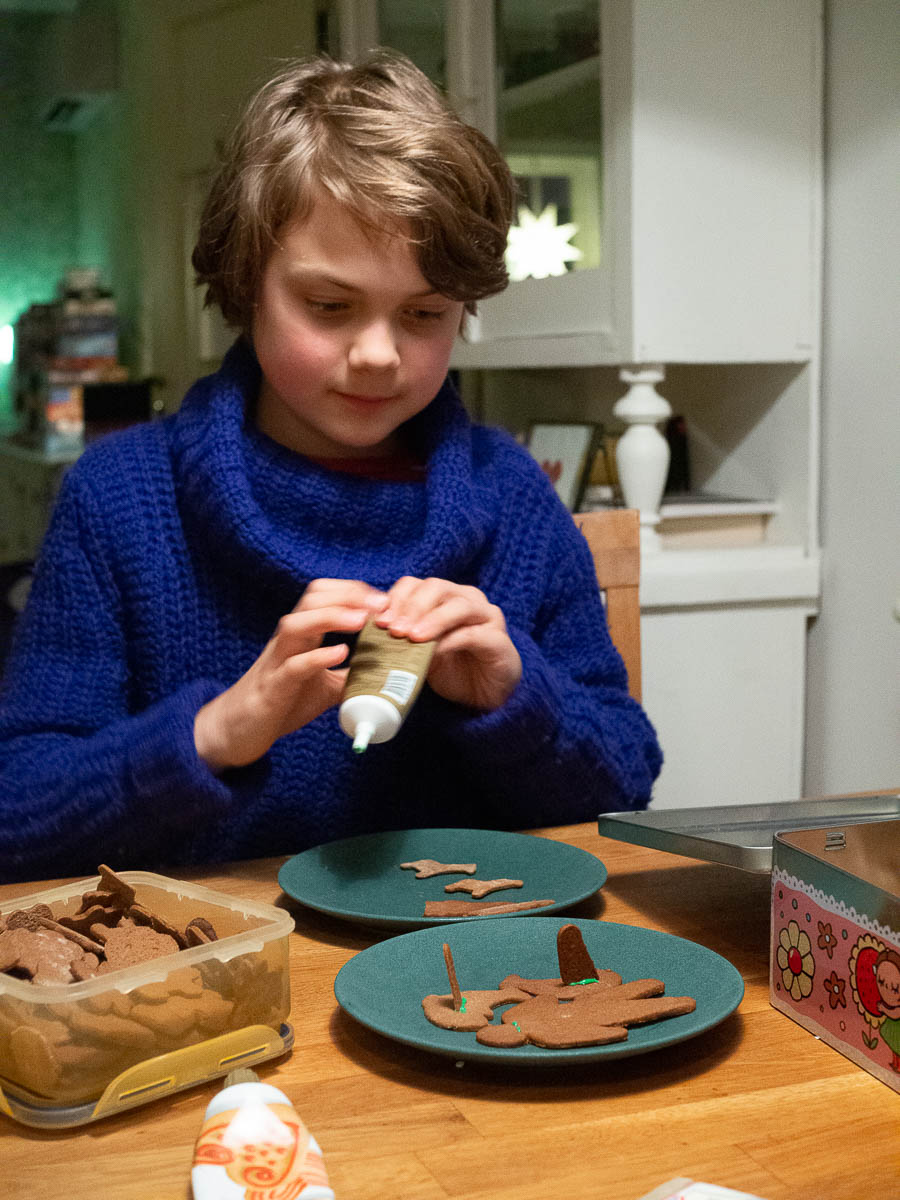 We decorated gingerbread cookies. Ingrid and I decorated hearts and trees and pigs. Adrian made bleeding sharks, stitched-up crocodiles, and Frankenstein’s monster with parts of different gingerbread men glued together.