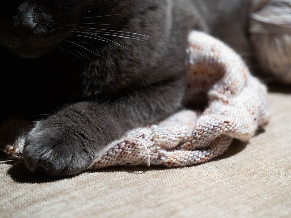 I can hold the knitting and work on it, and he doesn’t care (except when the colourful stitch holders twiddle back and forth right in front of his face and he just has to bite them).