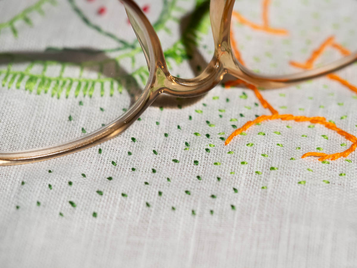 In bad light, towards the end of the day when my eyes are tired, looking at tiny things, I found myself having to move those things further away from myself in order to properly focus on them. Reading is not a problem at all, but embroidering seed stitch in lamplight or darning black-on-black were no longer effortless.