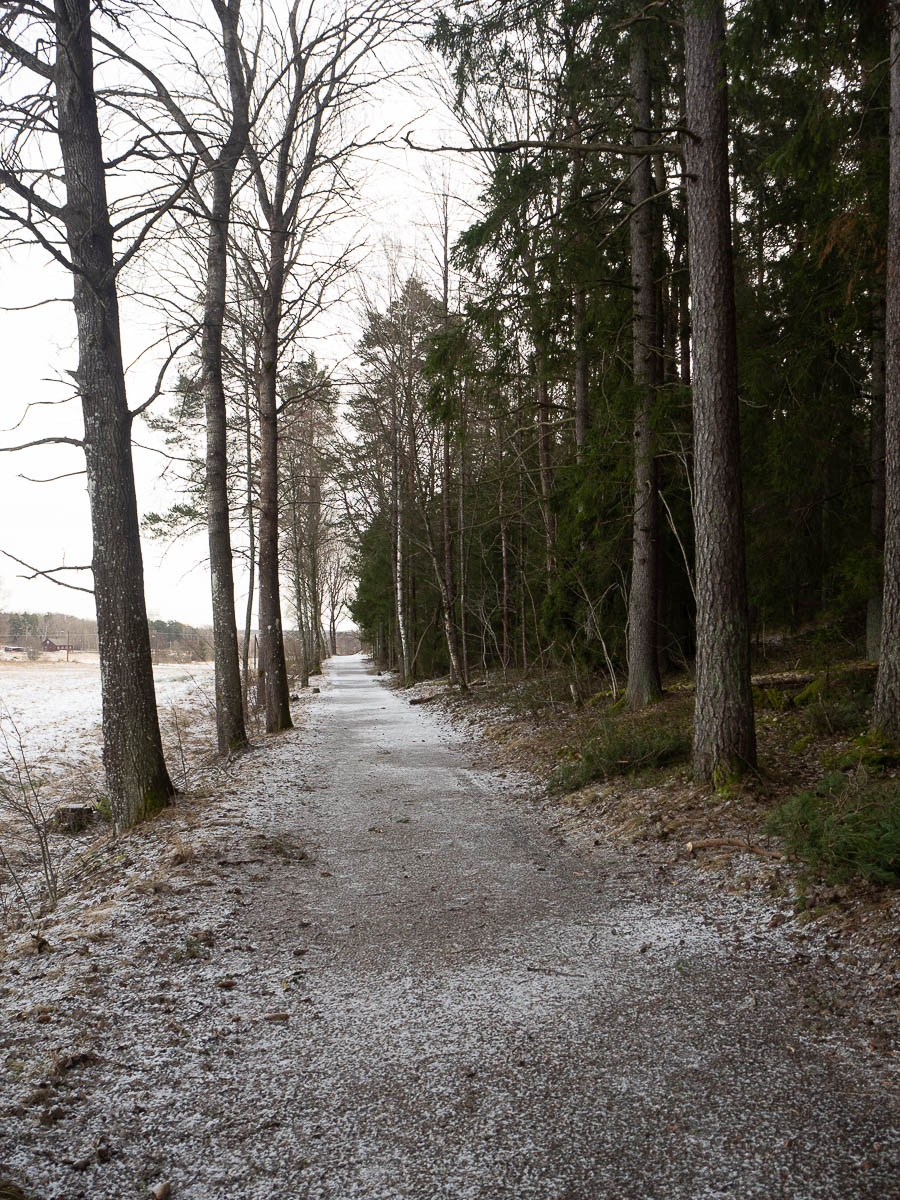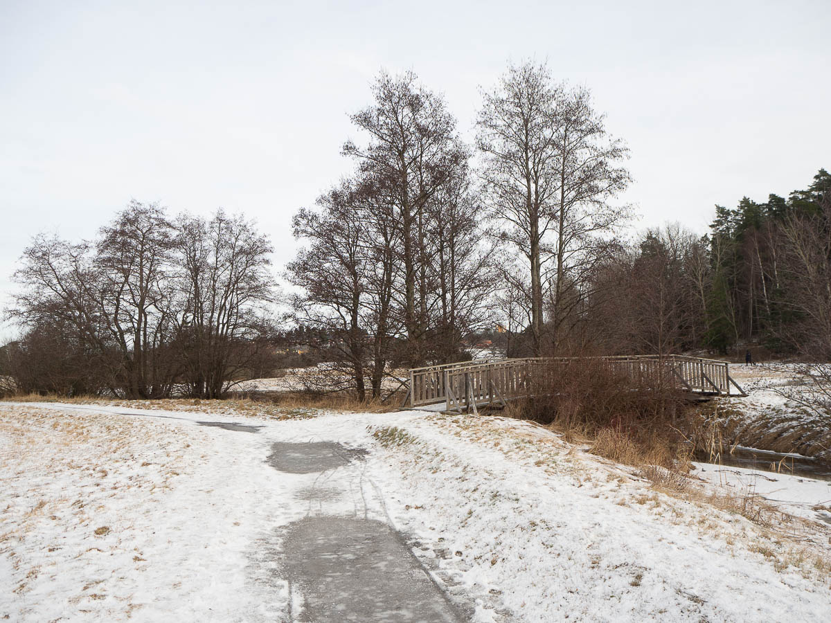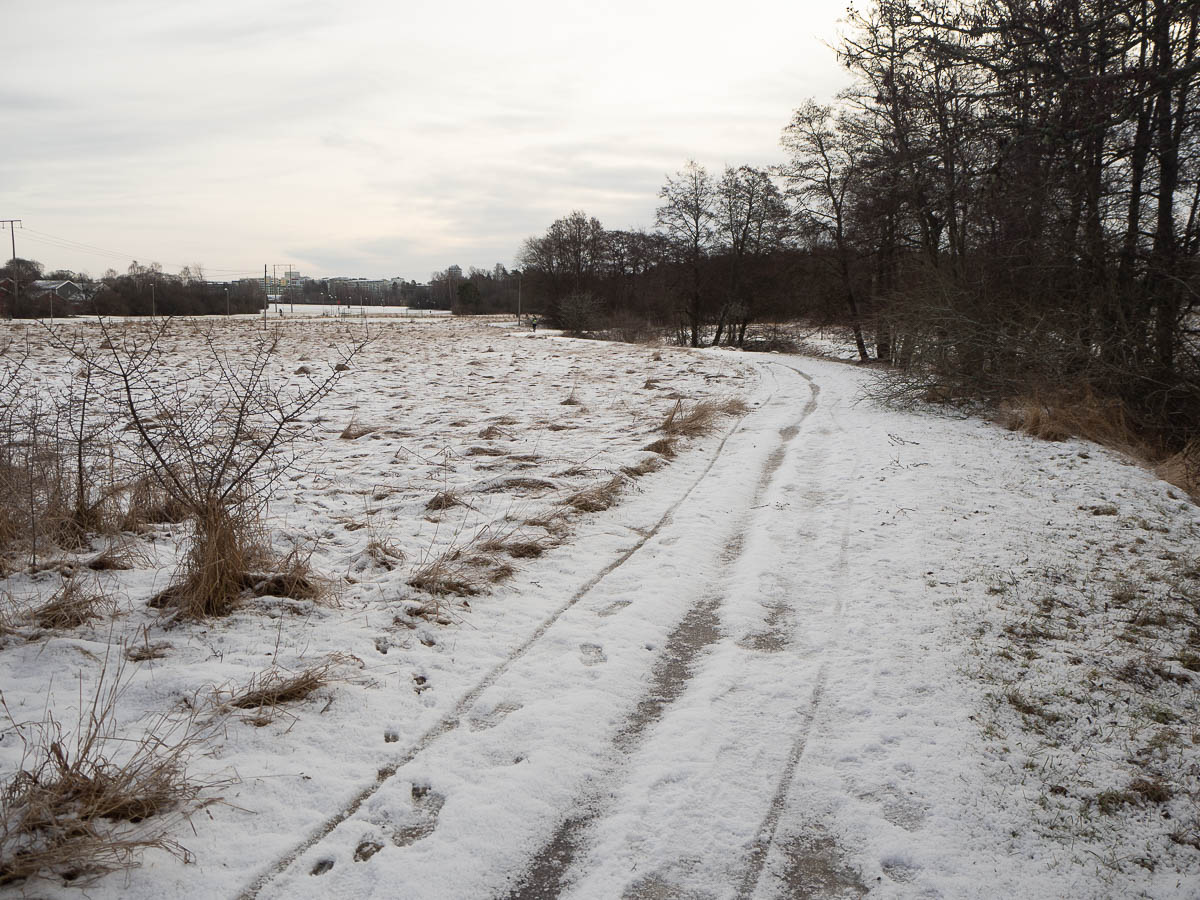 The first couple of kilometres were pure transportation along an asphalted trail from Barkarby to Akalla. From there on the trail followed Igelbäcken brook along the open fields of southern Järvafältet. The path was very icy at times, but usually there was space to walk next to it.