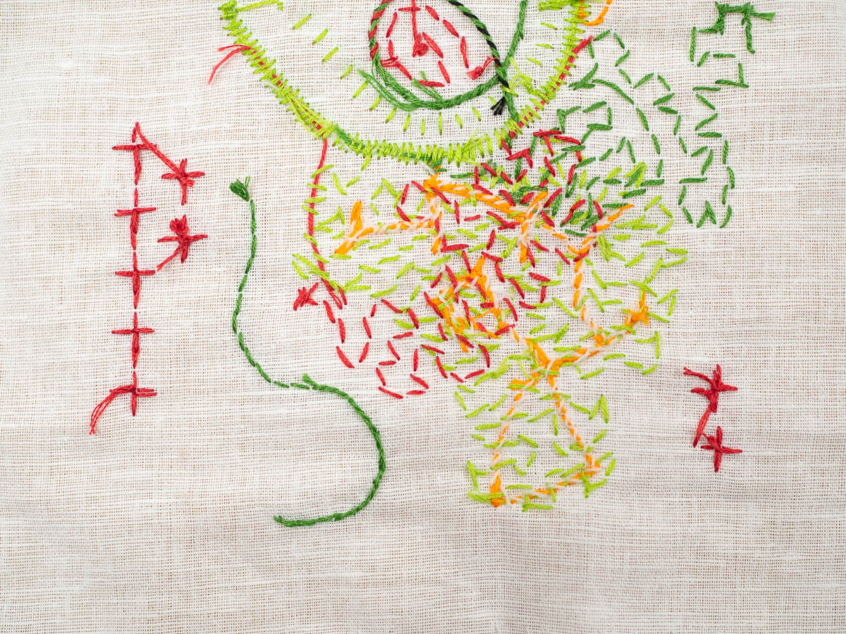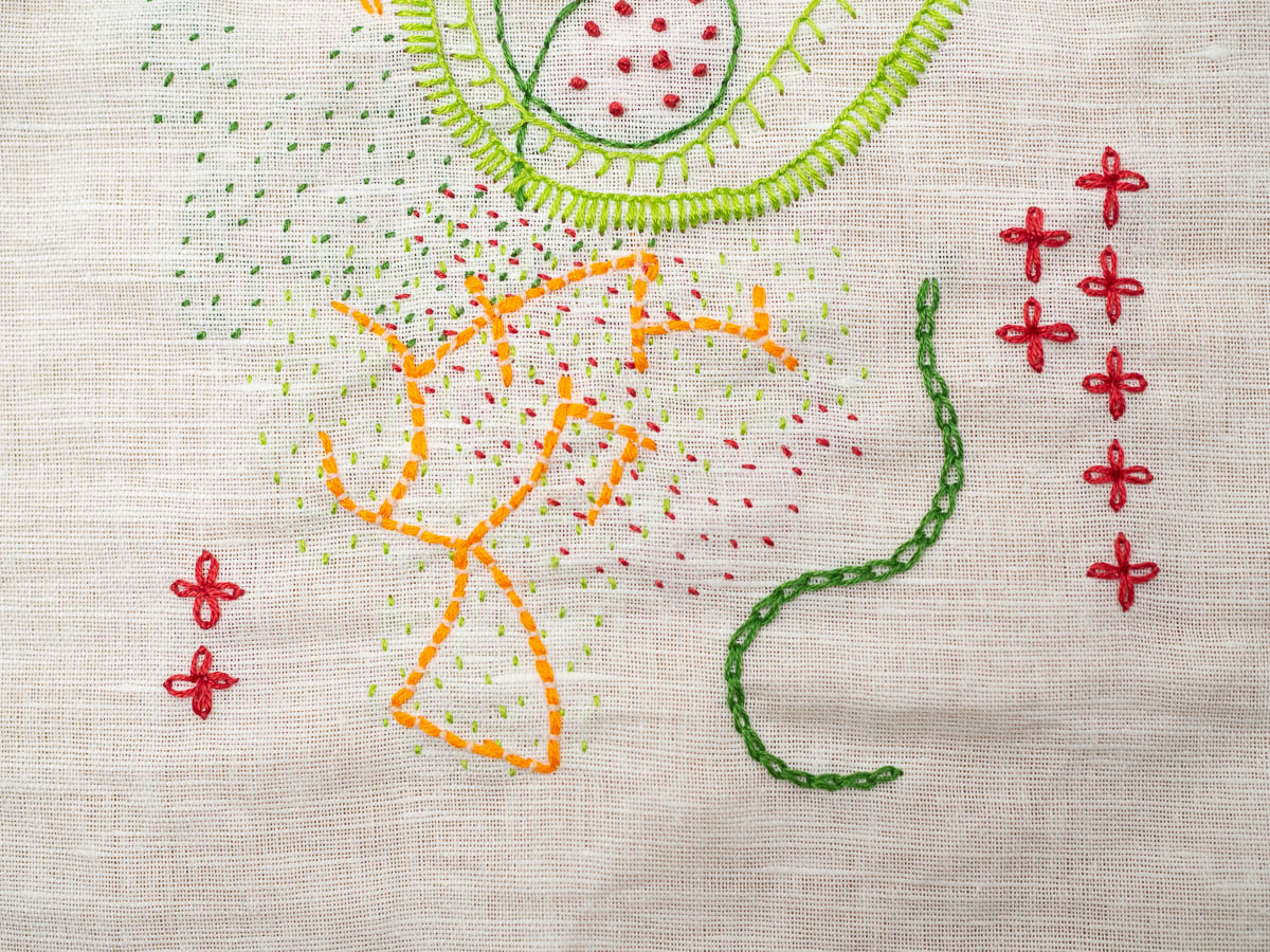 The dogma embroidery, continued. (Add chain stitch. Use a colour you don’t normally use. Add a pattern. Echo a part of your motif elsewhere. Emphasize a part of your work with a similar colour.)