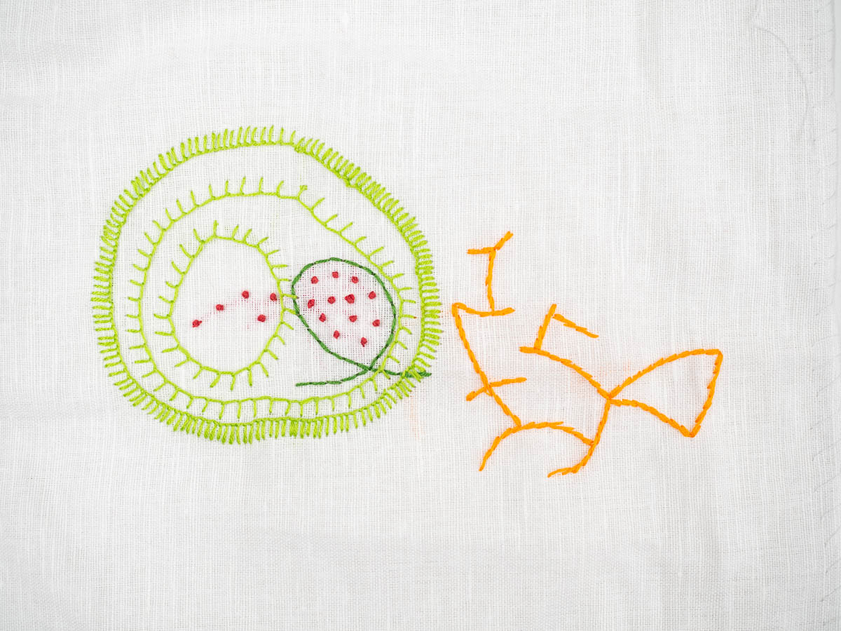 In our case, since most of us were doing it for the first time, one of the members who’d done it before provided us with rules, one by one, so we’d see what dogma rules might look like. The first rule was “a 30×30 cm piece of fabric”. Then “using the greenest thread you have, start in the middle of the fabric, and make 30 backstitches”, followed by “at least 10 French knots” and “a doodle that doesn’t look like anything”. The next step, “three circles of blanket stitch around the French knots” was a bit of a challenge because there was not much room but I just had to think bigger.