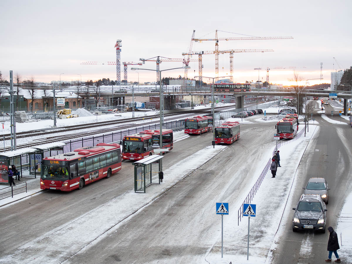 Early morning in Spånga, with sunrise, cranes and bus station.