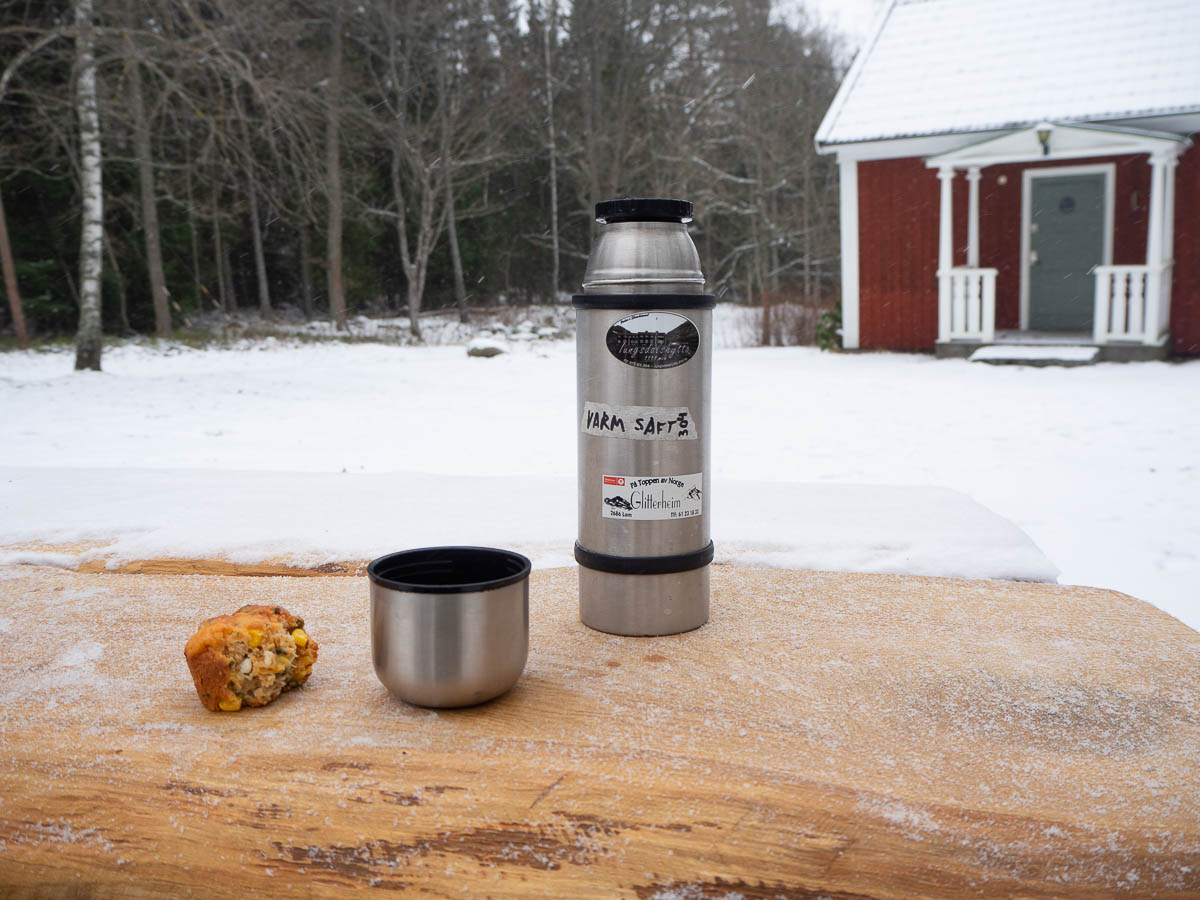 Lunch was leftover cheese and spinach muffins. I thought they might get all cold and hard after hours of freezing weather, but the warm air in the lunch box kept them insulated well enough.