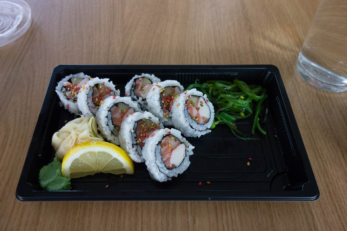 There’s a new trend at low-to-mid end sushi restaurants in Stockholm of smothering all sushi in sauces and toppings. Chili mayo, other mayo, even onion flakes of all things. I’m still expecting sushi to be served without this crap, and then I get an unpleasant surprise when I get my meal. And I usually don’t remember this until I’m already staring at the problem. But today I remembered, and asked them to skip the toppings, and actually got to taste the sushi itself.