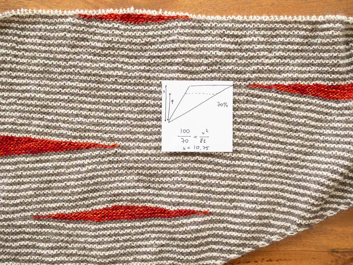 Most of the maths I did in school was maths for maths’ sake. Brain training, preparing for higher studies, etc. I’ve had very little use for it in everyday life. So when I do need it, it’s kind of gratifying. Today I used the properties of similar triangles to figure out sizing for my shawl. If I have 9 full pattern repeats after using 70% of the yarn, how many pattern repeats can I get if I use all of it? There is a red insert after every pattern repeat, and the last insert is a special one. Will the special one be the 9th, 10th, or 11th?