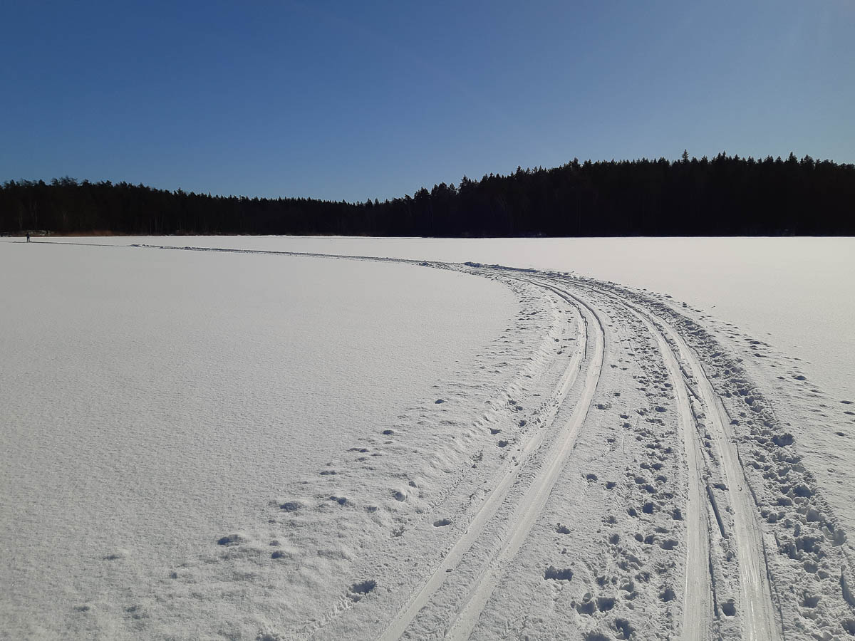 There was no doubt that we were getting closer to civilization today. No more untracked trails – now we had snowmobile tracks to follow. Which can be convenient at times, but they can also be icy and uneven, and more work than they’re worth, so we ski next to them.