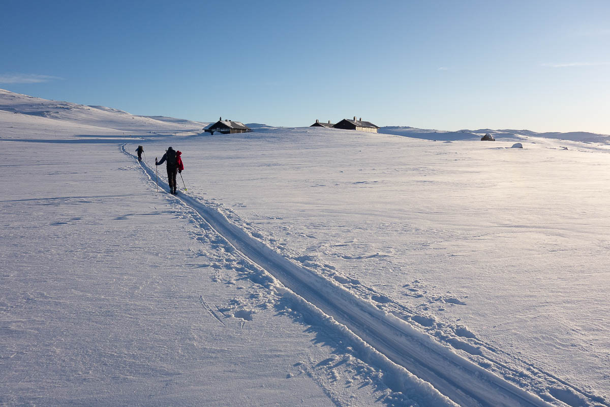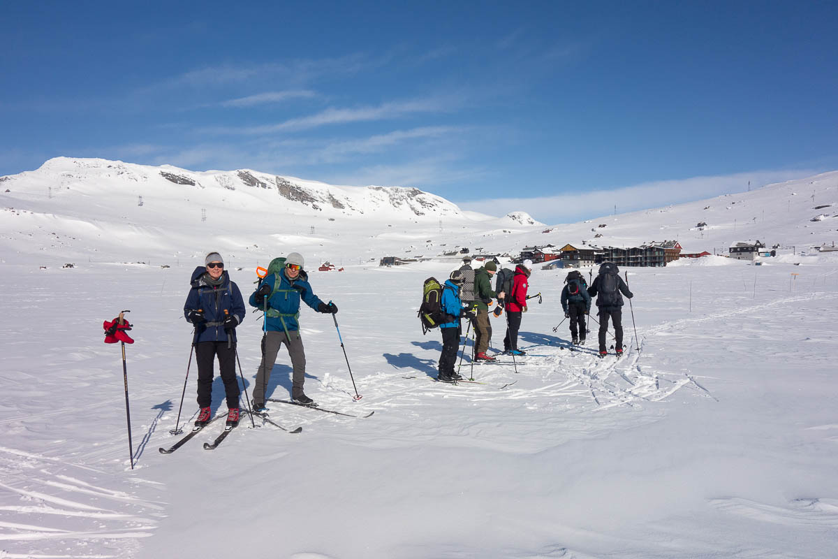 The weather forecast for Finse today was horrible, when I checked even as late as yesterday evening. We were promised –10°C and strong winds. Instead we got a day of brilliant sunshine, just a few degrees below freezing, and almost no wind. Absolutely perfect skiing weather, and beautiful views.