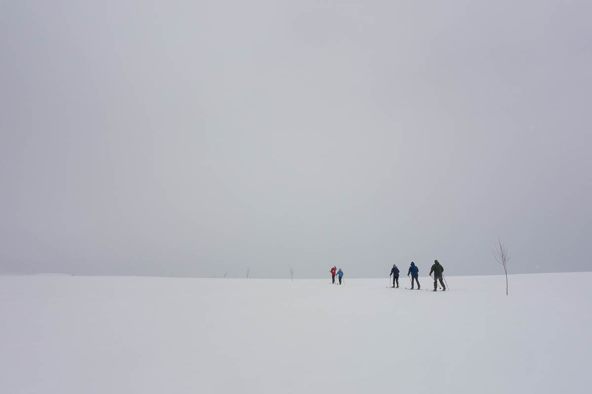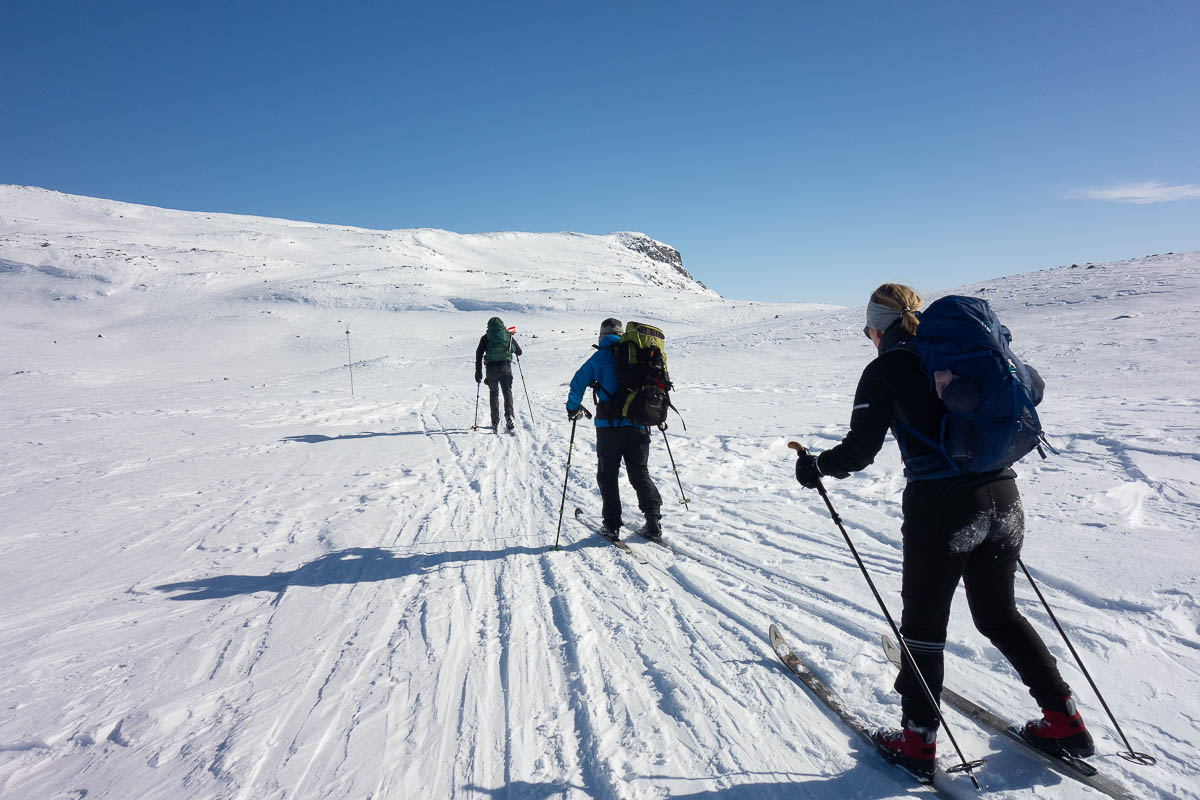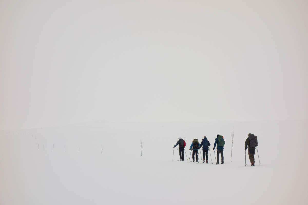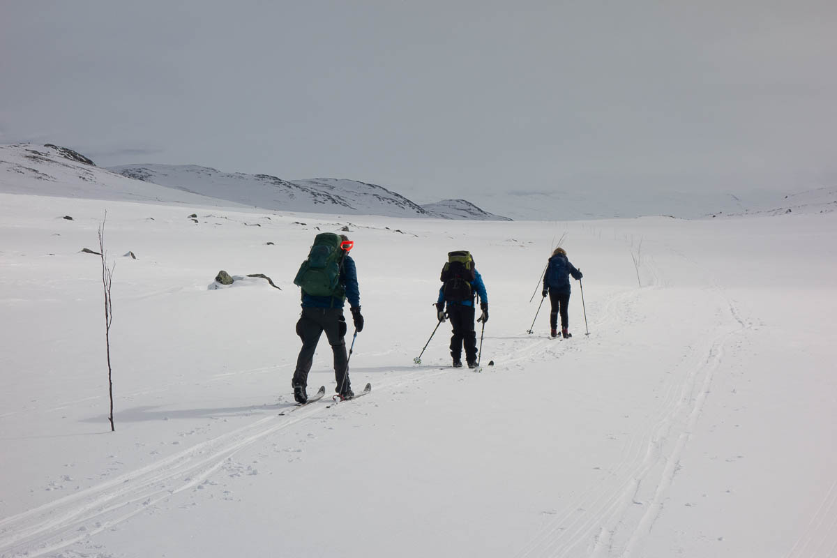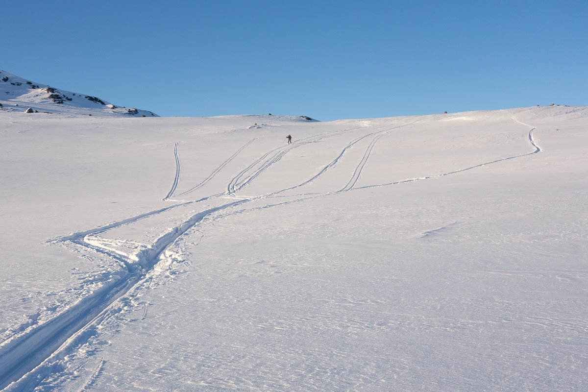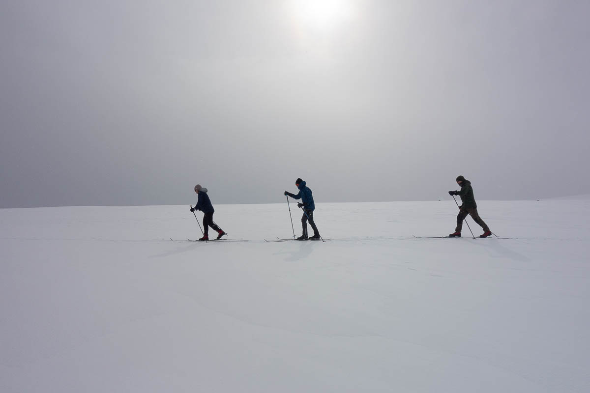 The day was overcast, windy and warm. The snow was warm and squeaky, sticking to my skis until I applied glide wax. Glide wax is one of those things that I make sure to pack every time, but don’t know if I will actually use, and then sometimes think that maybe I should just leave it at home – until the moment when I need it and realize that doing without would have been really, really inconvenient. Just like climbing skins, which we also only used on a single hour-long occasion during this trip, but which were absolutely necessary at that time.