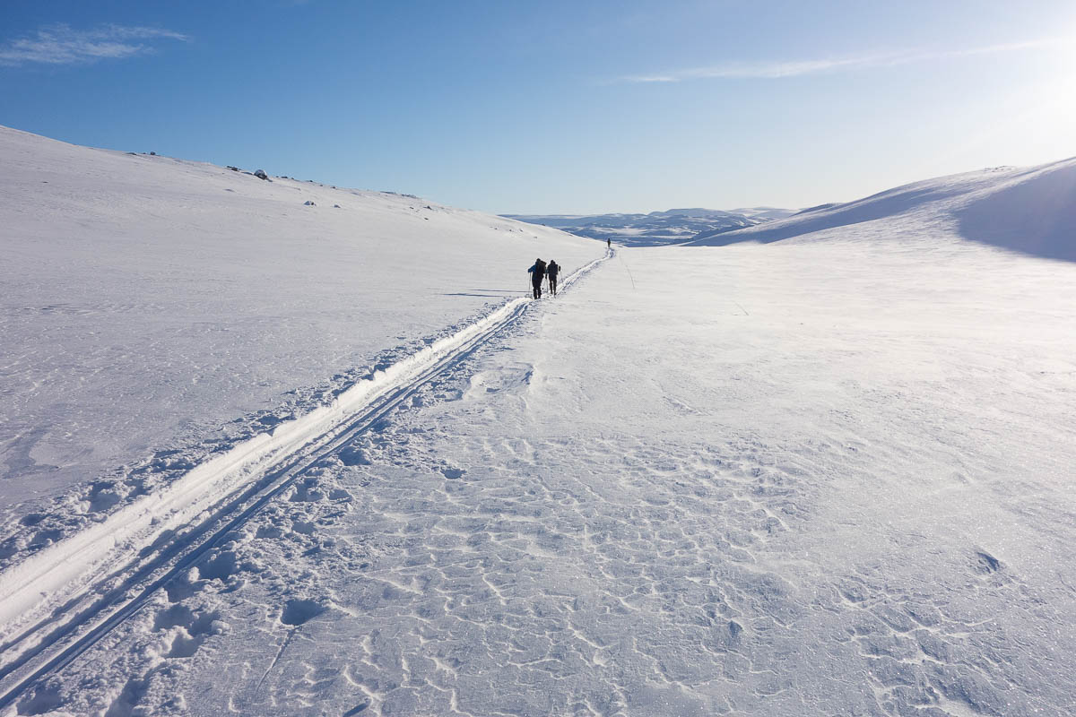 The plan for today was to ski from Kjeldebu to Rauhelleren, which should be about 25 km. Unfortunately the weather forecast promised very strong wind (gusting up to 100 km/h) together with plentiful snowfall. Planning for 8 hours of skiing in horrible conditions would be nothing short of reckless. But we also didn’t want to get snowed in at the small, chilly, unmanned hut with limited amenities.