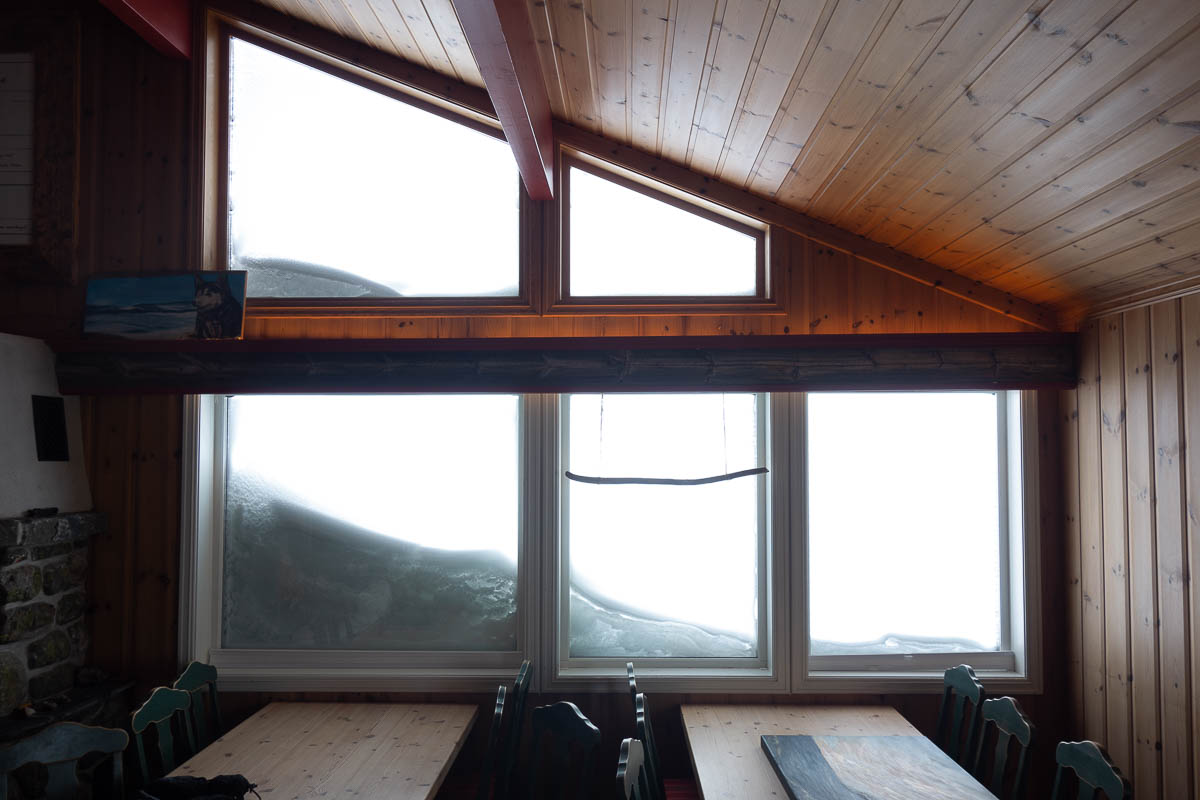 Minutes later a cloud descended, or maybe it was a fog that the wind blew up the slope. Either way, we were suddenly enveloped in water vapour. No more warm sunshine, and no more stunning views. The hut just disappeared.