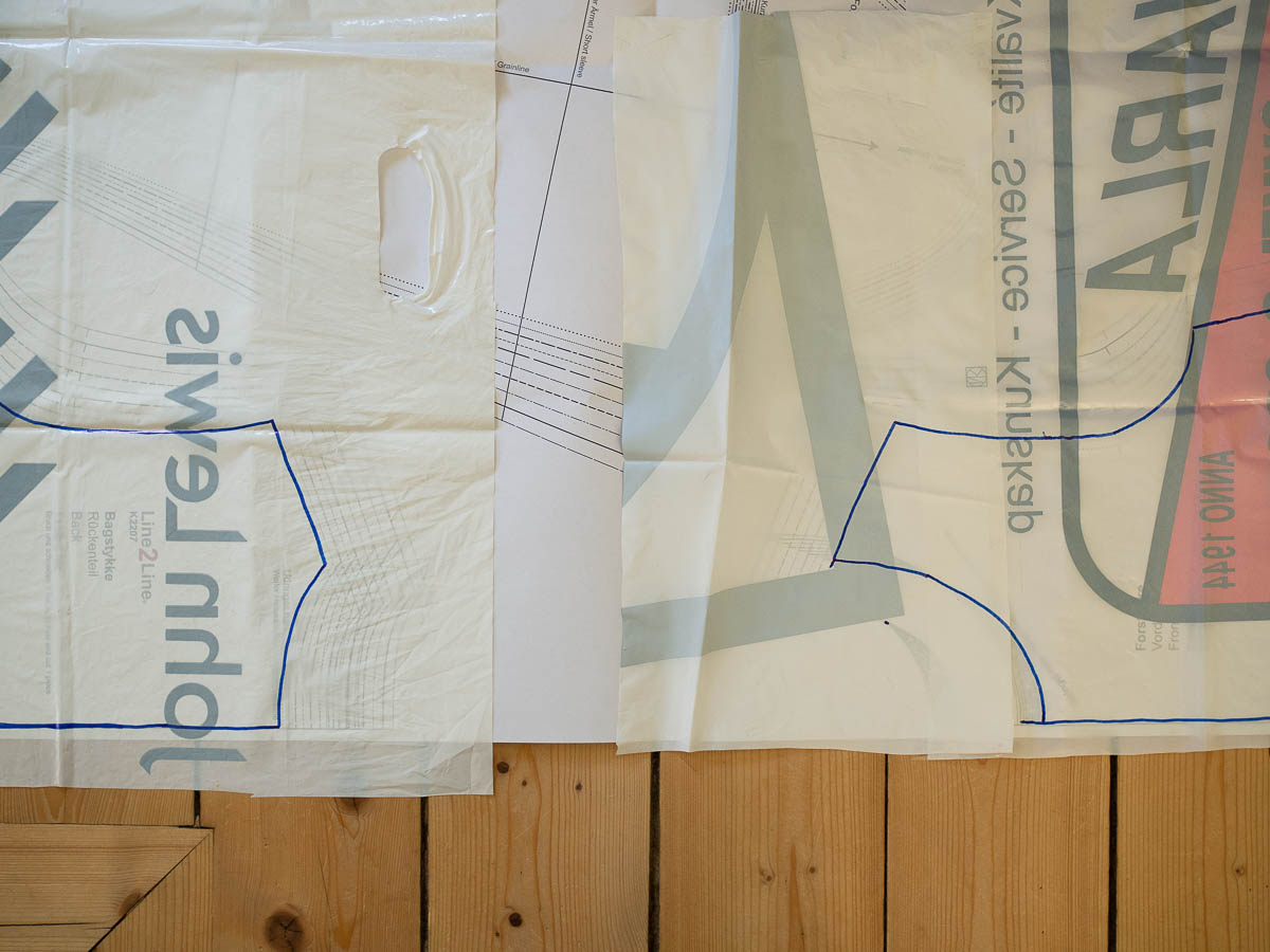 The pattern looked like the clothing patterns I remember my mum tracing from Burda Moden magazines in the 1980s. Except the Burda pattern sheets had tens of items all on the same sheet, so you had to trace the ones you wanted, whereas these modern ones are apparently meant for single use. I couldn’t make myself cut up my pattern, though – because what if I want a different size or something – so I traced it onto some old plastic shopping bags.