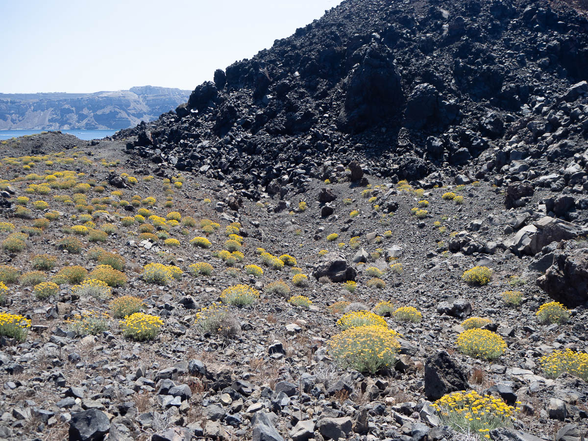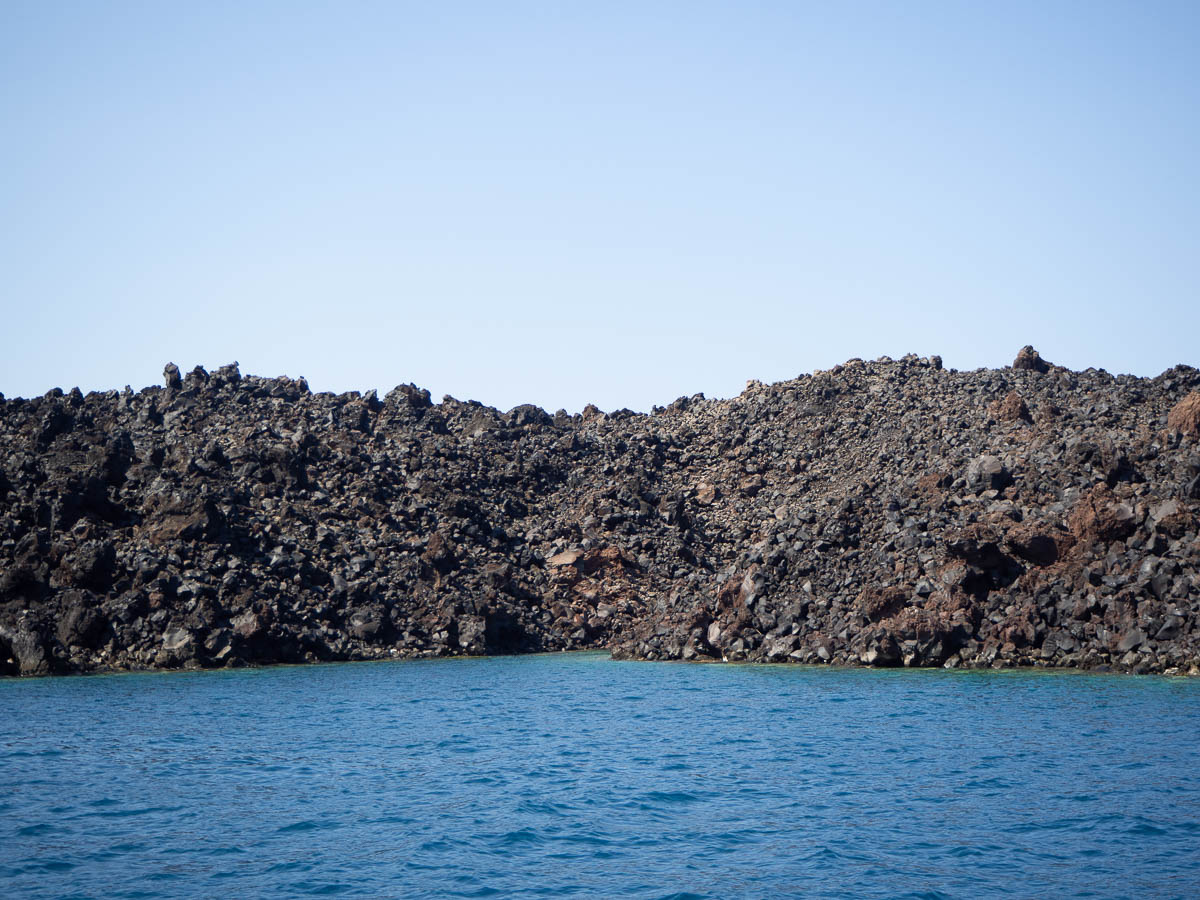 Nea Kameni is the island at the middle of the Santorini caldera. It first emerged about two thousand years ago and has grown as ongoing minor eruptions have added more and more lava to it. The newer parts are still pure rock with nothing growing on them yet.