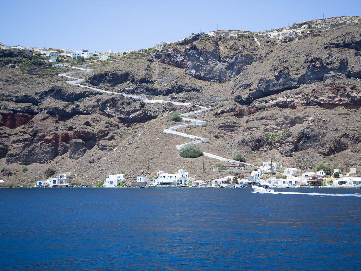 The third island, Thirassia, is older – a part of the island that existed before the Minoan eruption. Old enough to have some vegetation and human habitation. The boats stopped here for lunch.