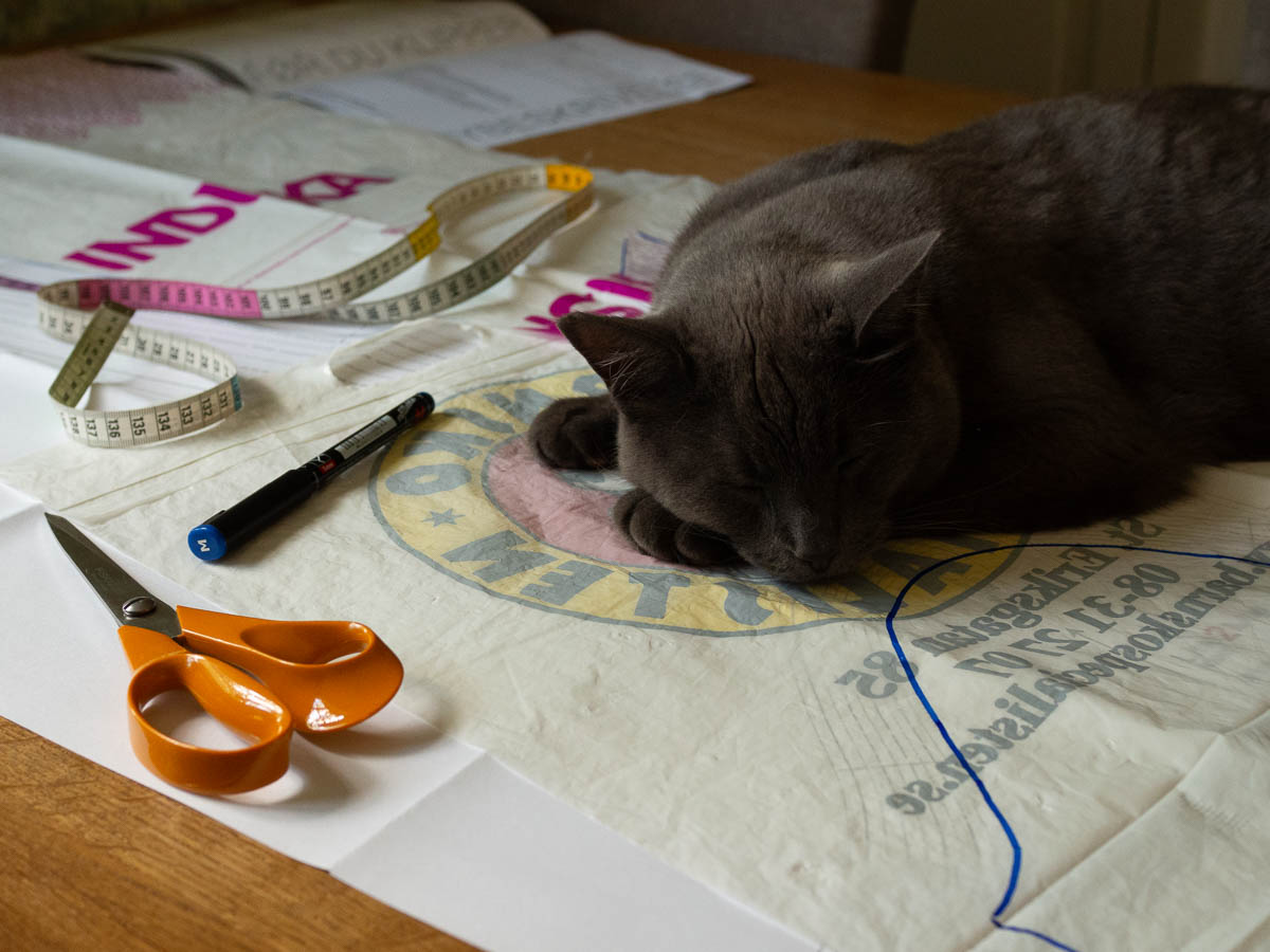 I was going to sew but Nysse felt like asserting his territorial claim over the materials on the dining table.