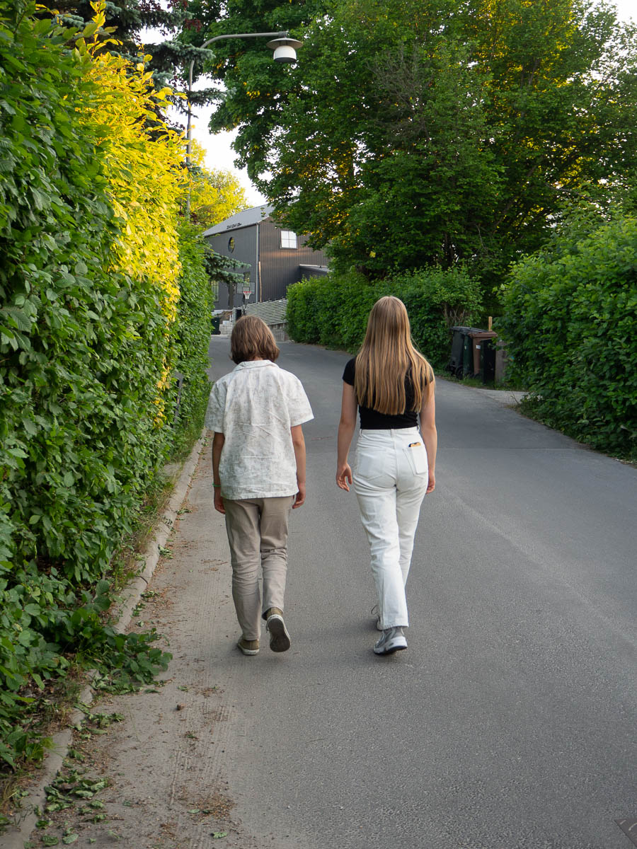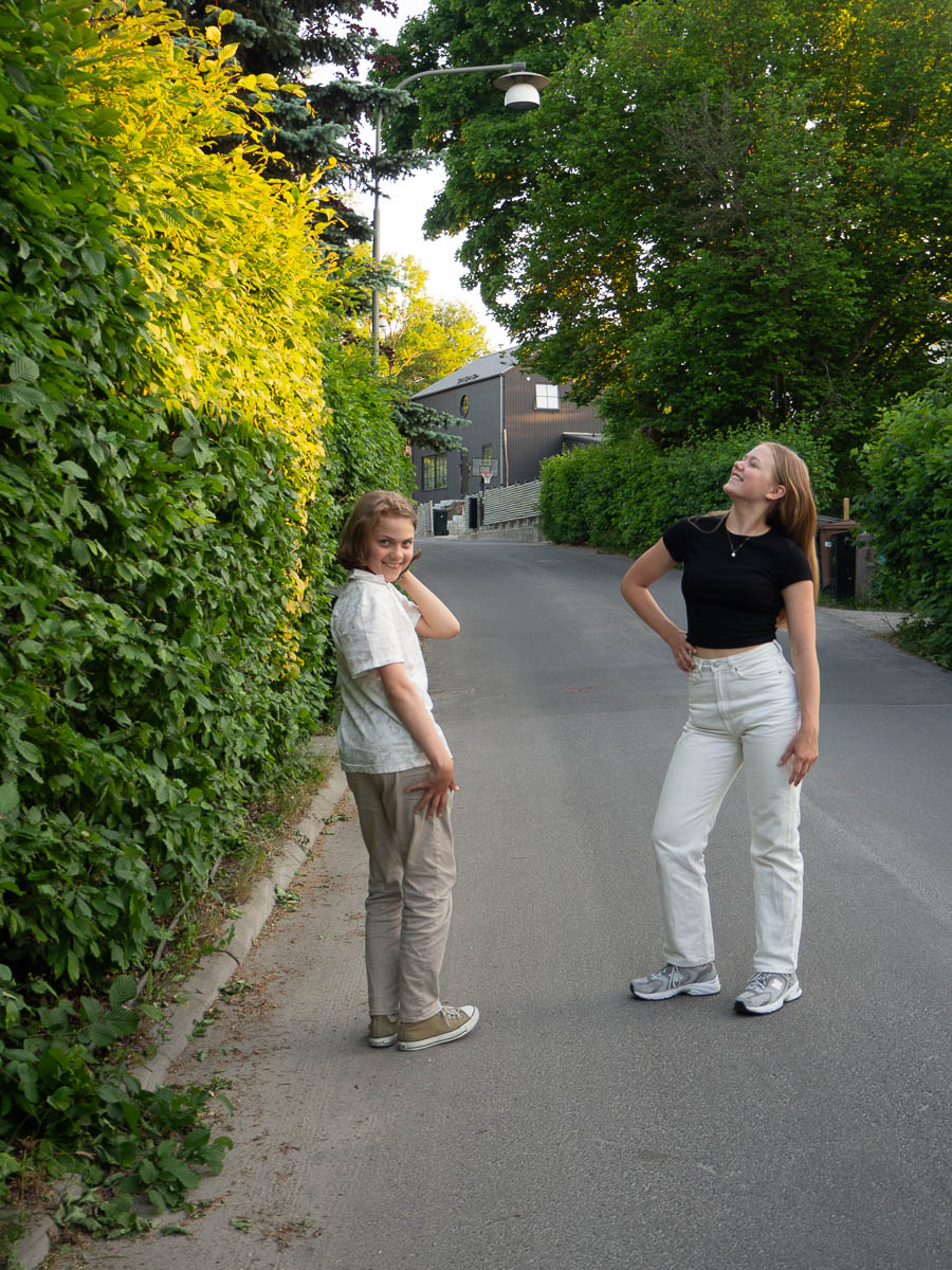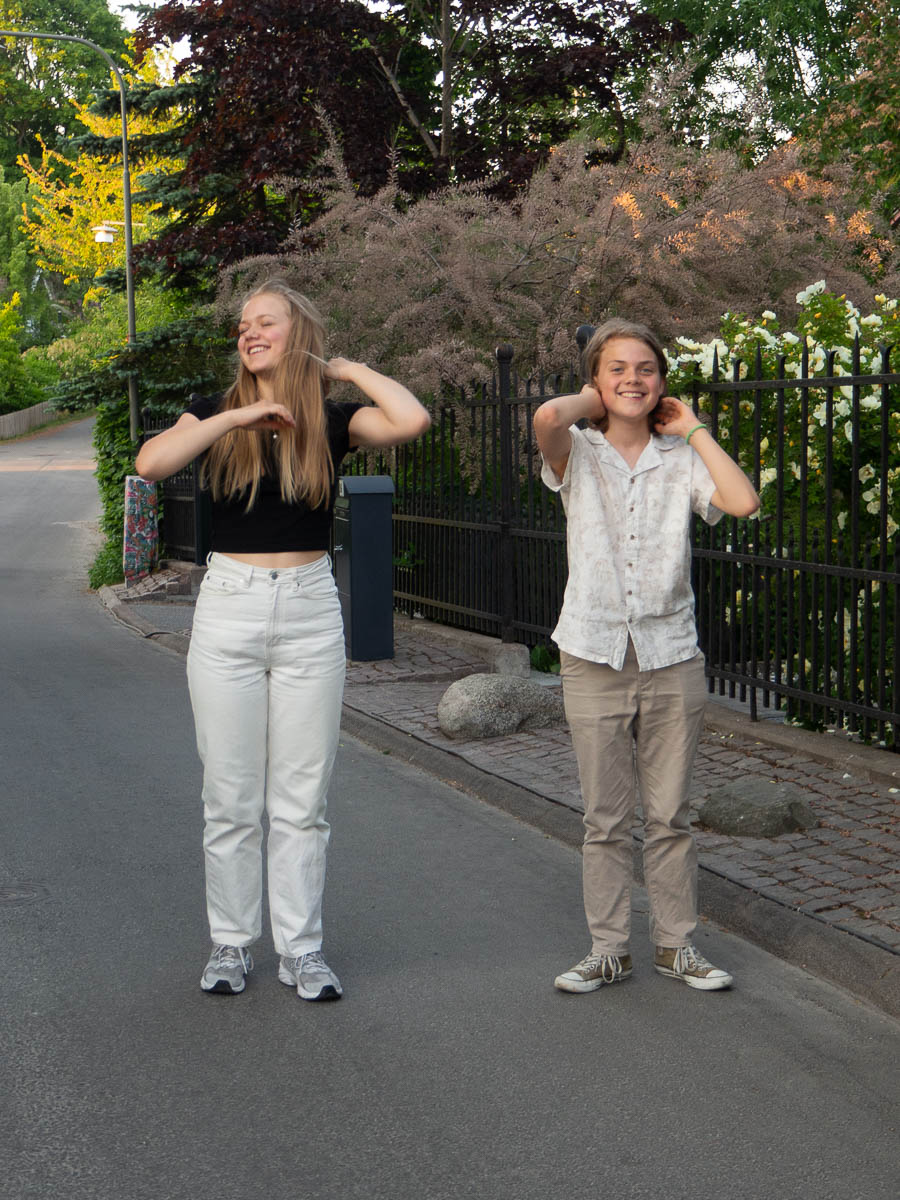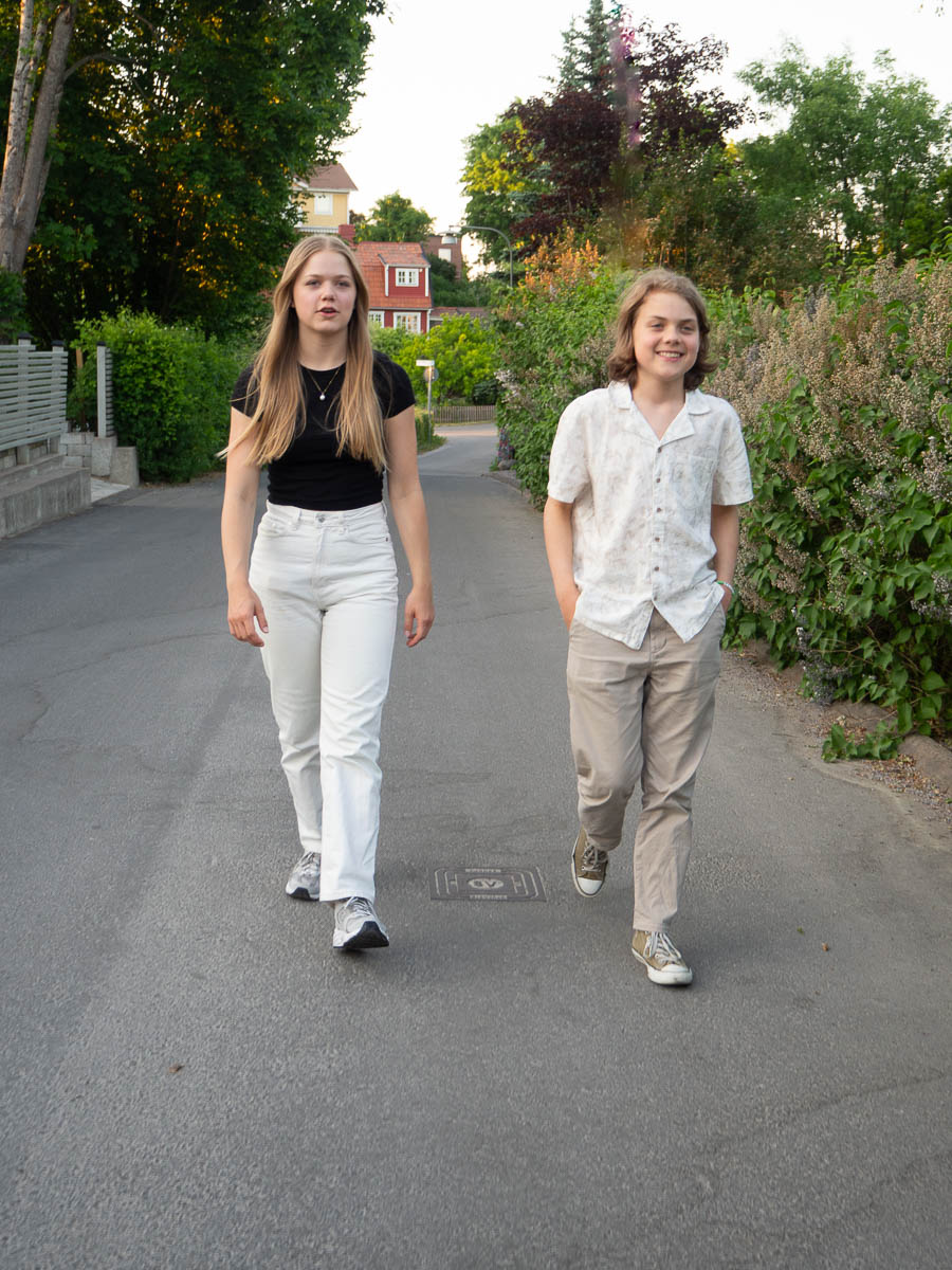 At the end of the evening I realized I hadn’t taken a single photo, although I’d gone there with a firm plan to take some. Especially since I get so few photos of Ingrid and Adrian these days, when they’re mostly doing their own things in their own rooms. We were almost home by this time, so I asked them to slow down to give me time to get out the camera. Their interpretation of “slowing down” was a slow-motion walk.