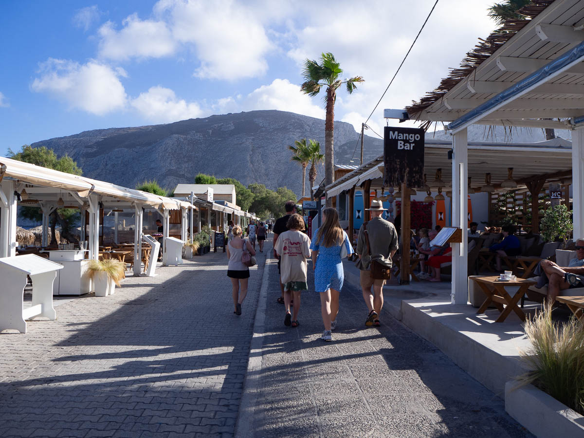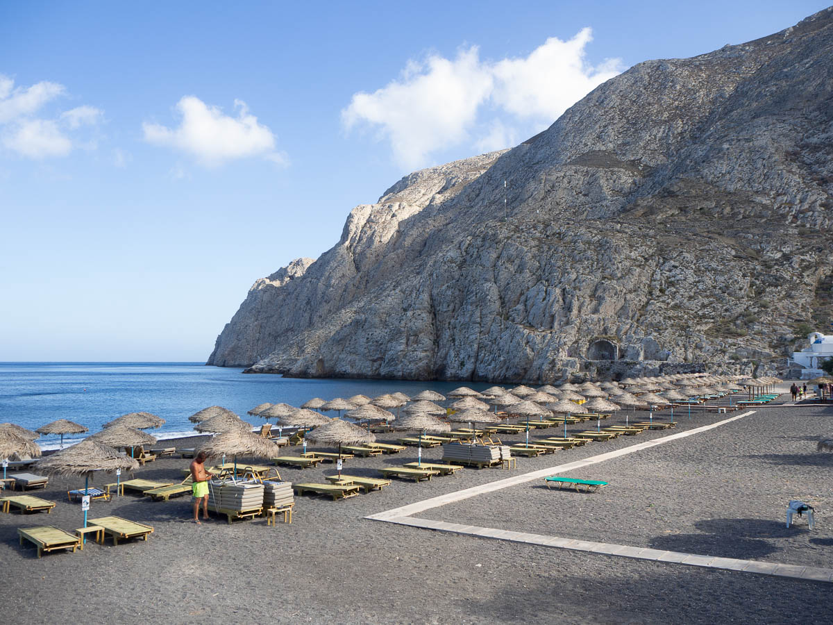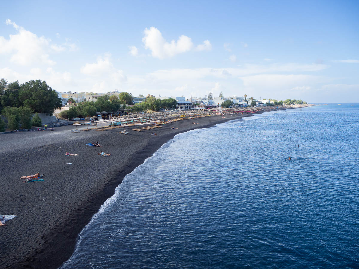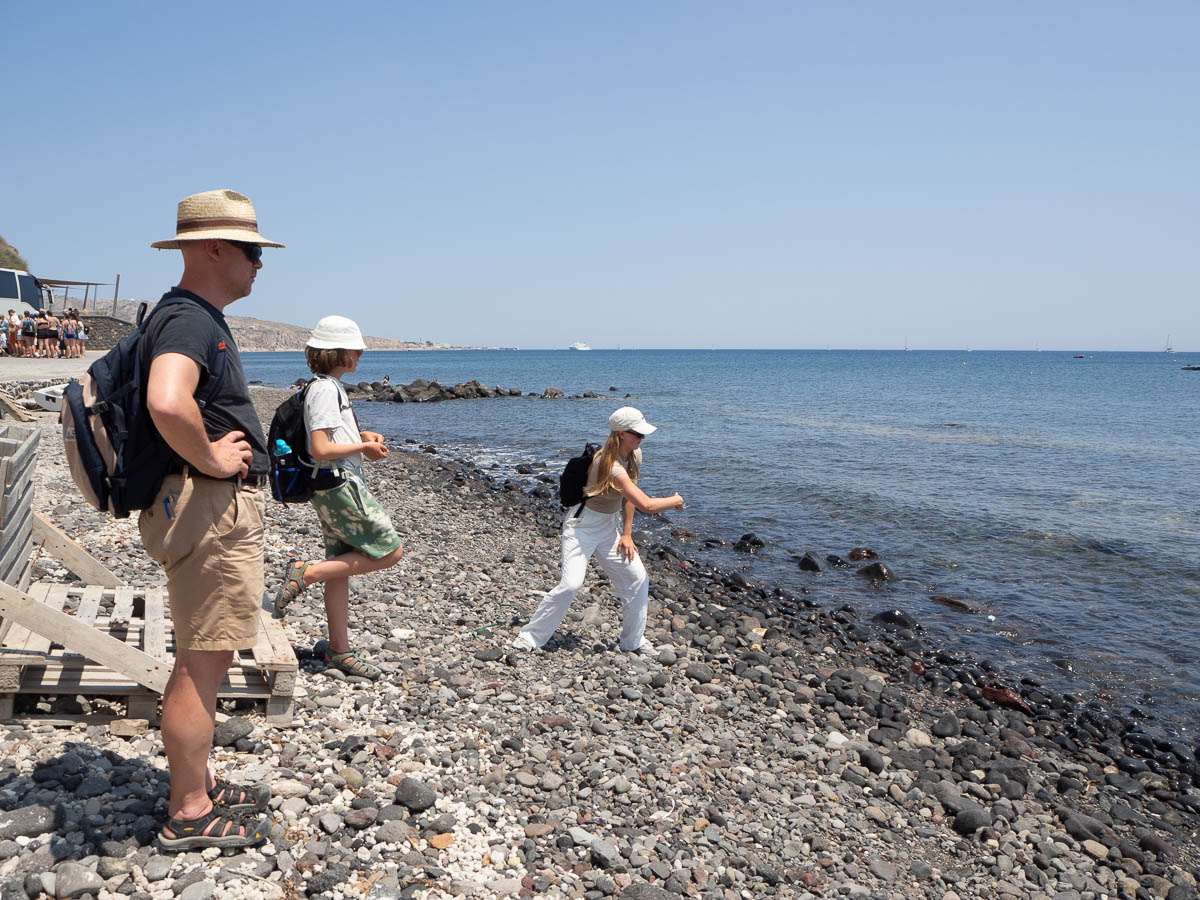 We’re on a week’s vacation on Santorini. Today was mostly travelling, although we had some time in the evening to explore Kamari, the village where we’re staying, and its black pebble beach, and the long beach promenade.