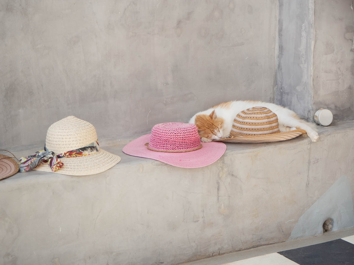 Santorini has a fair number of stray cats, that seem to be tolerated most everywhere. There is one who visits our hotel every morning at breakfast time, whom we already recognize, and we’ve seen others feel at home at cafés and restaurants.
