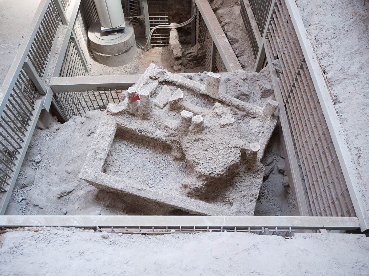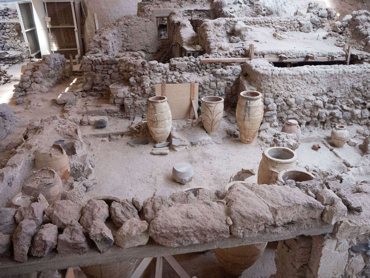 The site was interesting to see, but I was disappointed to find out that absolutely everything they’ve found – tools, household objects, frescoes – has been carted off to museums in either Fira or all the way to Athens. Only the walls and stairs and streets themselves are left here, as well as a few token clay vases, and castings of bed frames, for some reason. (Wooden objects rotted over the centuries, and left behind hollow spaces in the volcanic ash, so when any hollows were found, the archaeologists made casts of them all.) They haven’t even put up replicas or projections or even posters with images.