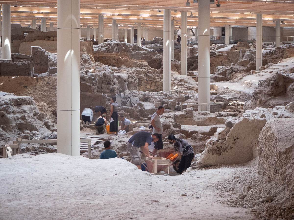 A non-walking day today. Instead we visited the archaeological excavation/museum at Akrotiri. Like the site at the top of the hill near Kamari, this town dates back to the Bronze age. It was destroyed by the volcanic eruption in 1600-something BC and the excavation has been in progress for some fifty-odd years.