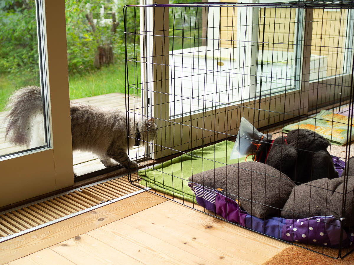 Now with Nysse’s recovery getting the physio’s approval, I’m trying something new. Since climbing to and from low, stable surfaces is OK, and walking on soft, wobbly surfaces is even encouraged, I’ve converted the bedroom into a cat-safe space. Sofa cushions all around the bed to give him a safe way up and down, and all other high surfaces blocked off.