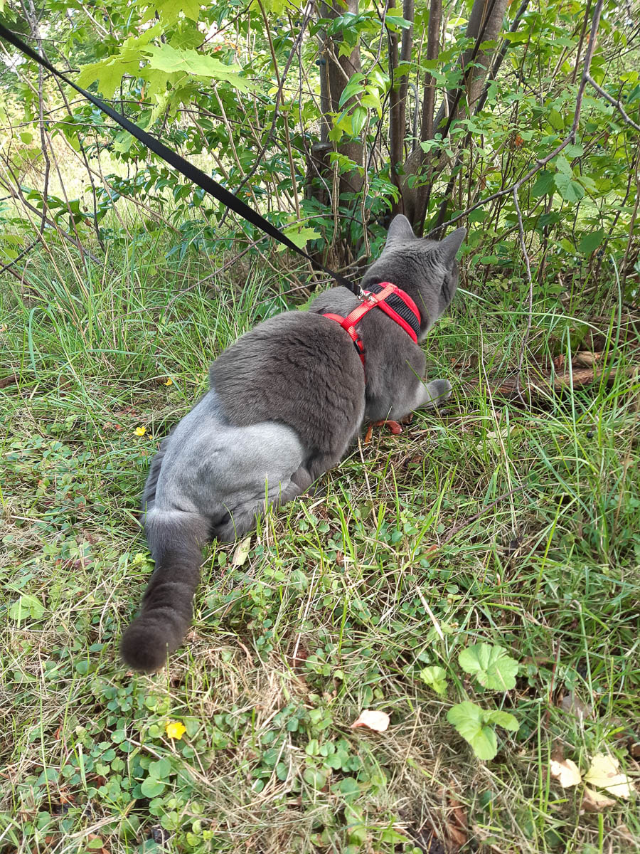 Nysse and I are now taking physio-approved leashed walks. Walking a cat is, well, not like walking a dog. There is not very much walking involved, really. Initially Nysse toured a part of the garden, perhaps to check that no other cat had taken over his territory. But then he saw a squirrel in the neighbours’ yard, and that was that. The rest of the “walk” he spent crouching in the bushes, watching the squirrel, dearly wishing he could go there and show it who’s boss.