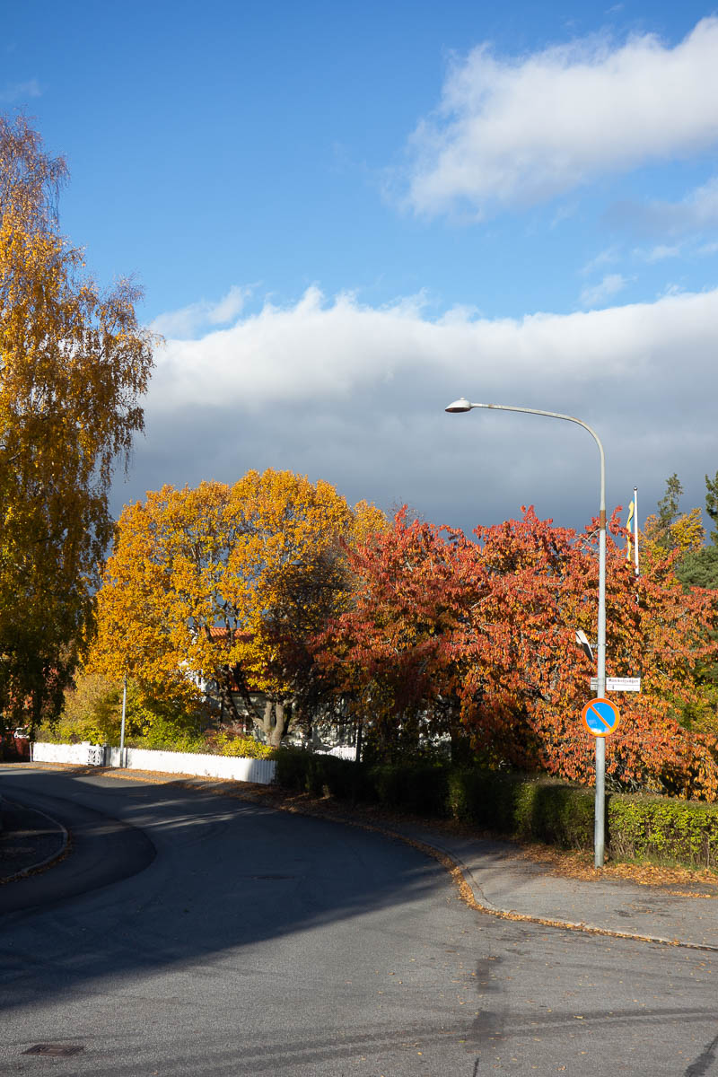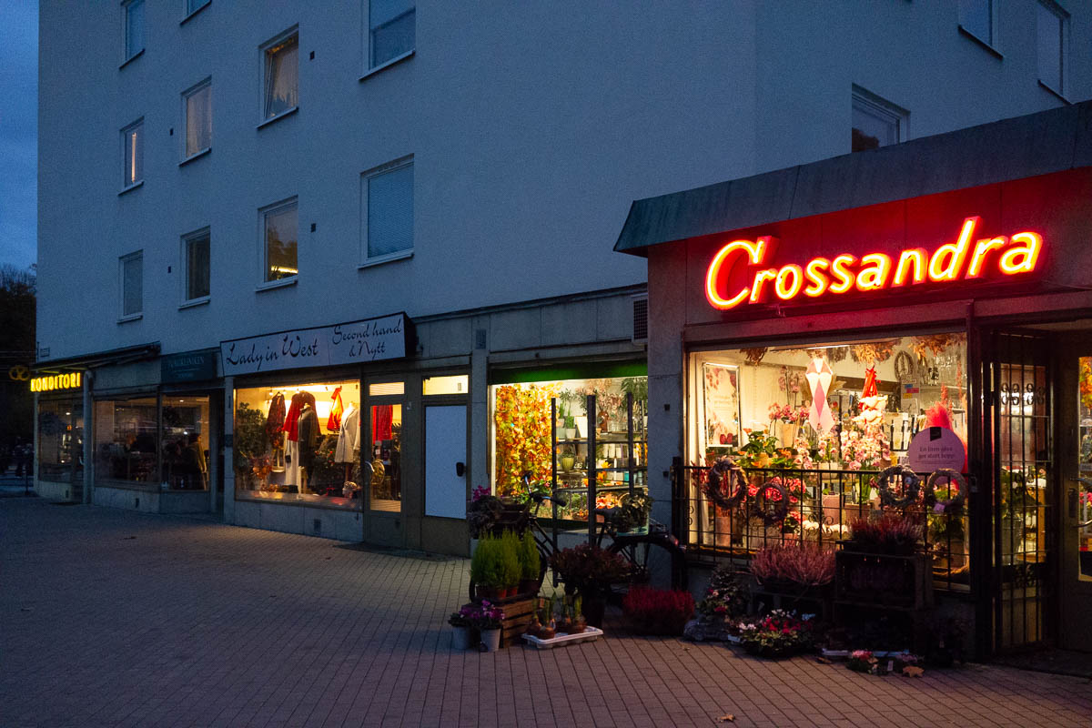 On Spånga Torg, the second-hand ladies’ wear shop has filled their windows with warm coats. The florist’s show windows are an odd mixture of Halloween, and pink for breast cancer awareness month.