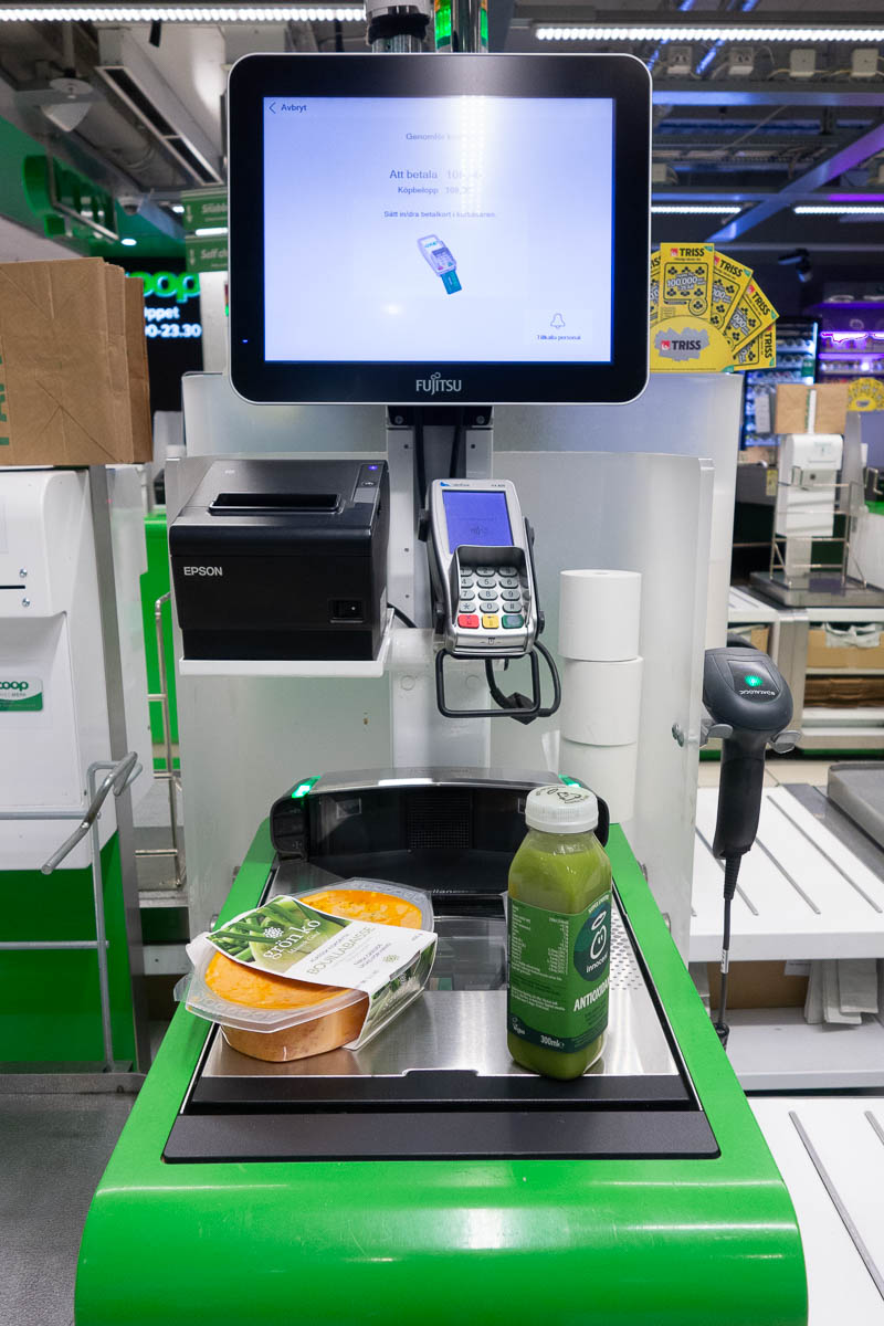 Many supermarkets have replaced most of their manned checkouts with self-checkout stations. I like it when I only have one or two things to pay for and can get it done quickly, but their occasional random checks really annoy me when they happen.
