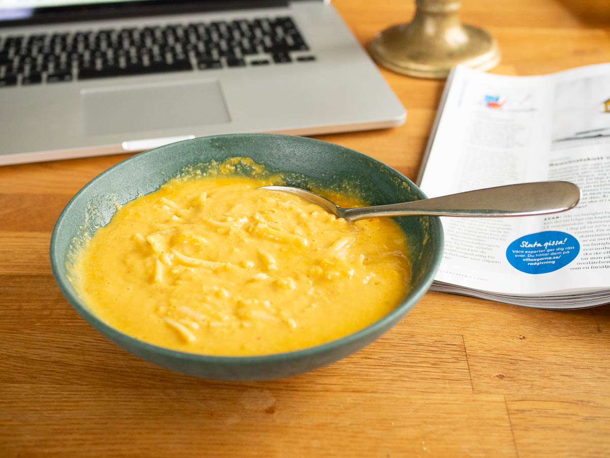 A hot meal always warms me up. Sometimes I have no full meals among the boxes of leftovers in the fridge. On days like those, I’d much rather have an odd but warming meal – like this combination of spaghetti with sweetcorn soup, or perhaps sweetcorn soup with spaghetti – than something like sandwiches or tortellini.