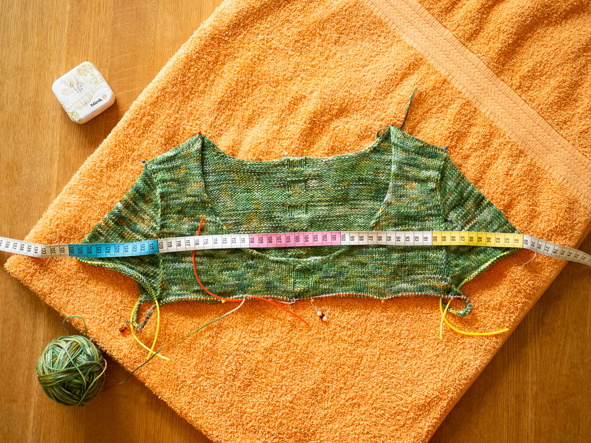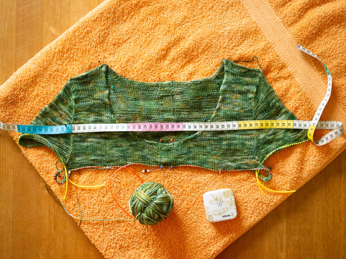 Yesterday I blocked this half-done cardigan to see if it might fit. The gauge swatch I knitted relaxed a lot when wetted, so I wanted to check this one before continuing with fiddly bits like buttonholes and sleeves. Seems OK, although I’m not sure about the neckline construction, or the width of the sleeves. I have to finish the neckline before I can reasonably evaluate it, though, and same for the sleeves.