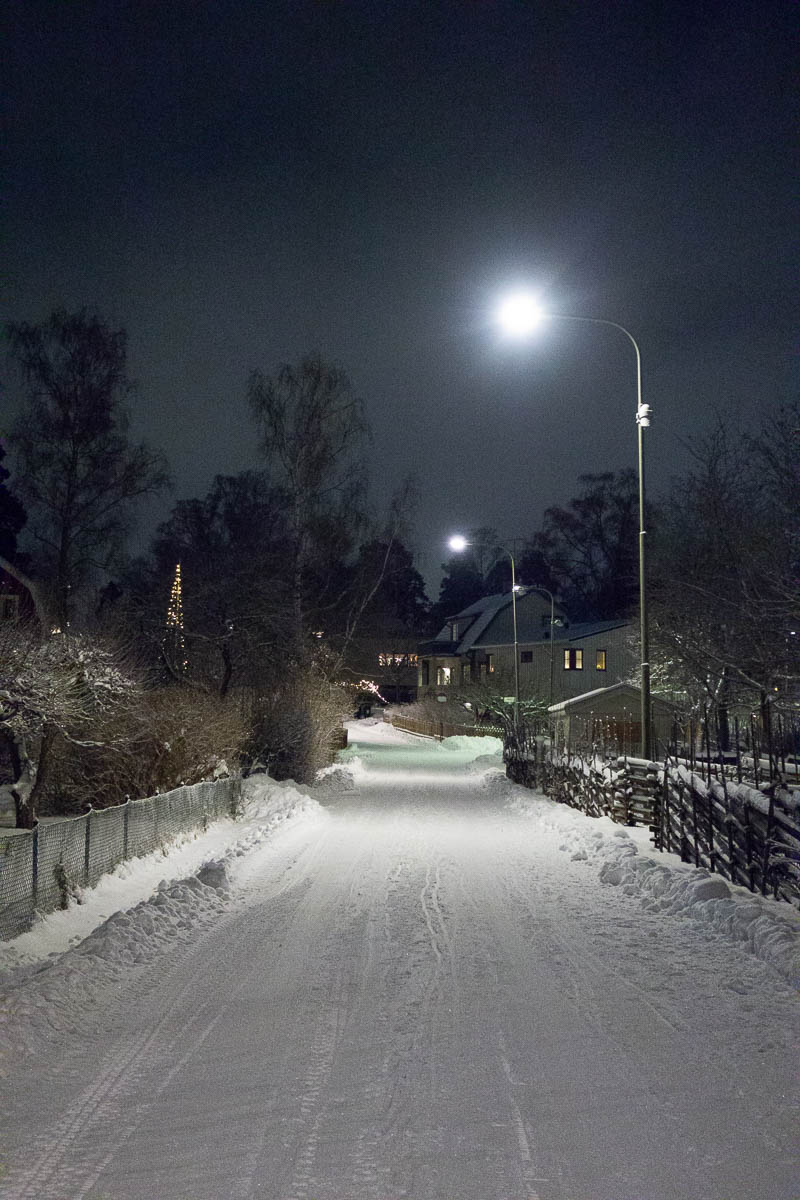 Crunchy snow, crisp air, dark sky. Very wintery.