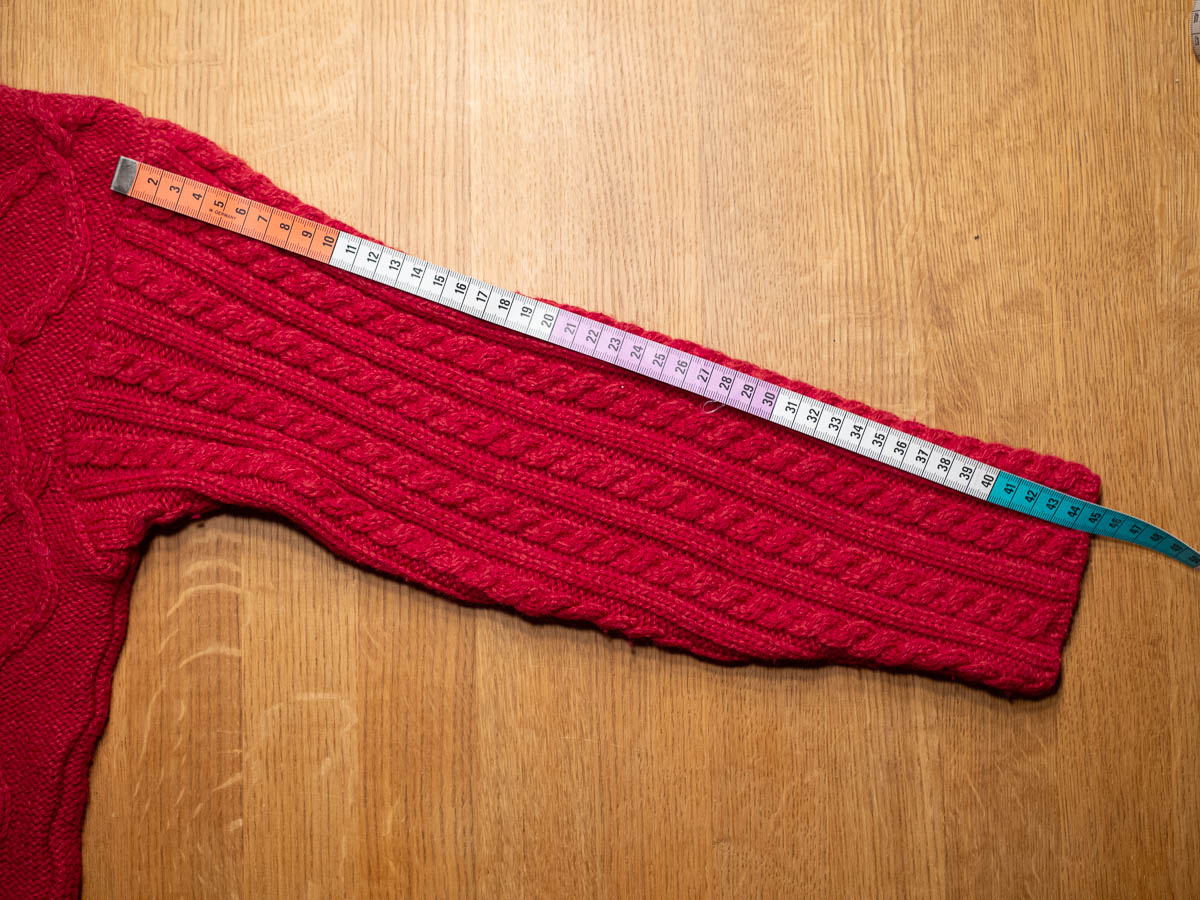 I wear a lot of wool during the really cold months. My own knitting energy comes and goes – I can make maybe two cardigans per season. I could buy, and I would buy, if I could find anything that I actually like, but most wool cardigans and sweaters are very expensive without being very beautiful. I search second-hand stores a lot, but the experience can be hit and miss. I found this lovely sweater, 100% wool, made in Ireland. But when I unpacked it and tried it on, it turned out to be much smaller than the size label indicated. Normal sleeve length for a ladies’ garment is around 55 or 60 cm; this one measured 45. Probably shrunk due to careless washing by a previous owner. Sad.