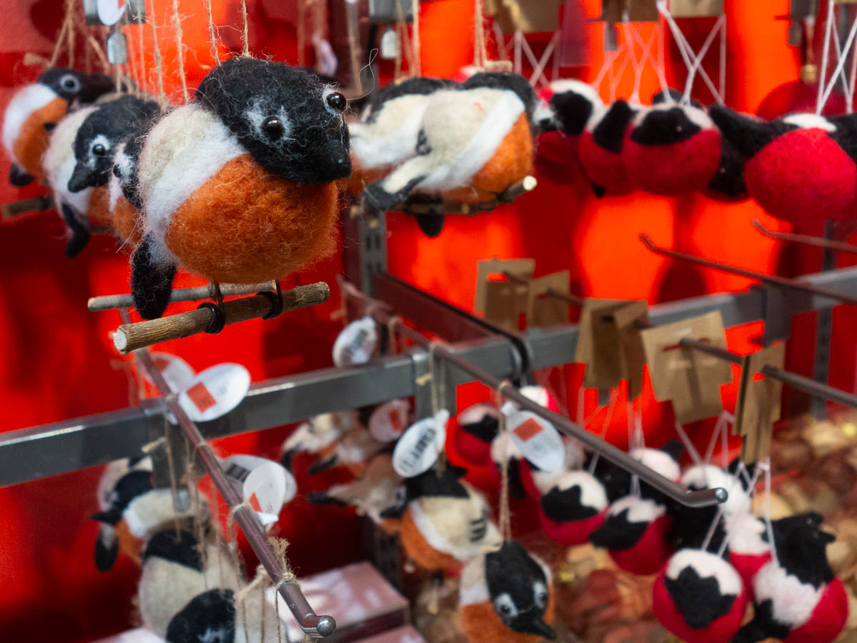 Oh, look, felted bullfinches! Except when I got closer, they looked like diseased, dying bullfinches. Eyes on top of their heads like snails, eyes askew, eyes nearly falling off. Not exactly Christmas vibes. Photos don’t do their ugliness justice, even.