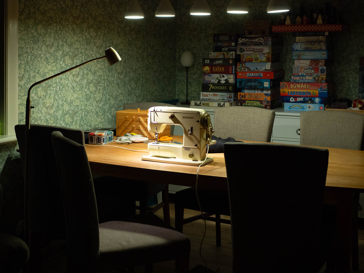 The new light fixture is so great. I put stronger lightbulbs in there than I thought we’d need, and now I’m glad I did so. I can sit and sew late at night, with black thread on graphite fabric, without even straining my eyes or wearing glasses.