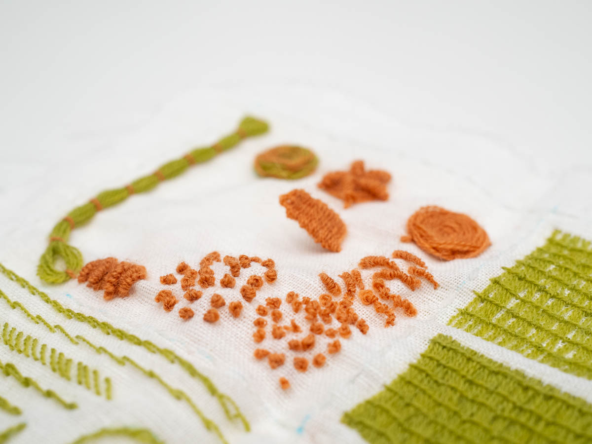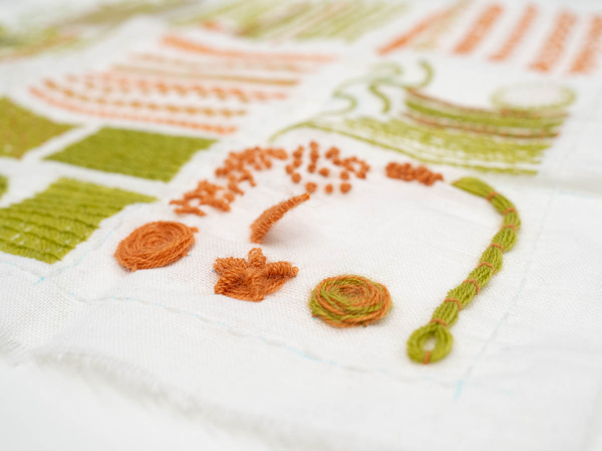 Bullion knots – like French knots, but elongated into tiny sausages – were even harder. They kept coming out like small, uneven worms. I think I had the wrong yarn for this – they’d be easier with a smoother, less grippy yarn.