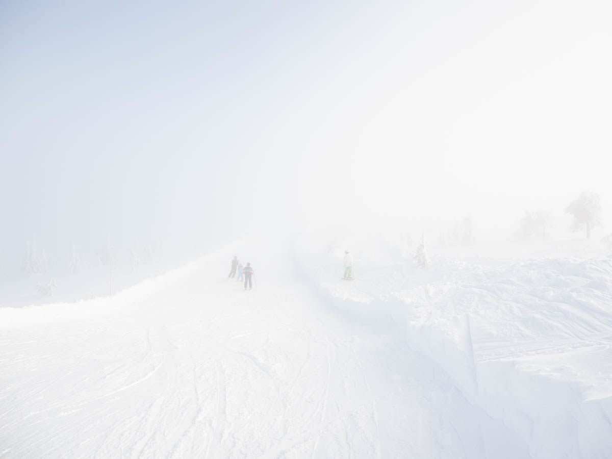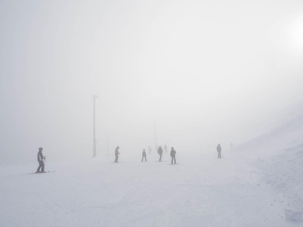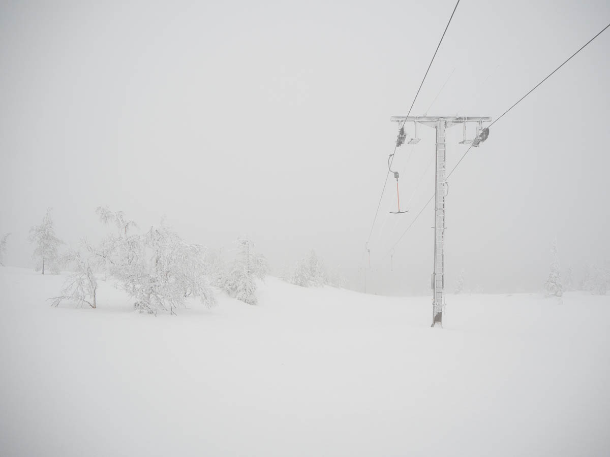 The weather conditions at the top were pretty bad, with low clouds and a fair bit of wind. At times it was difficult to see where the pistes even started. Aim between the neon orange sticks and assume that the piste will continue without any sudden changes, and hope for the best.