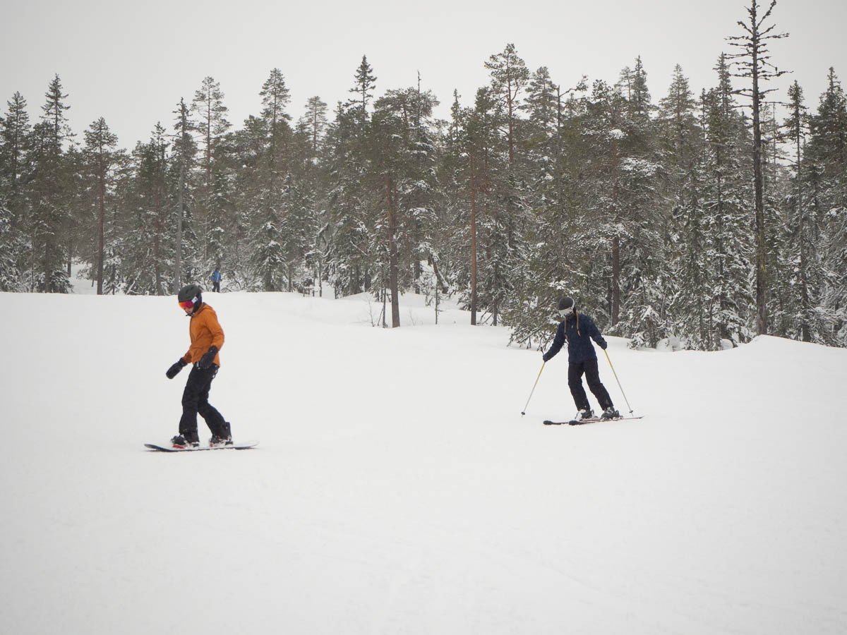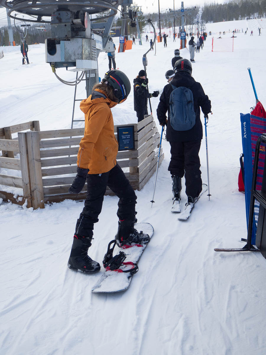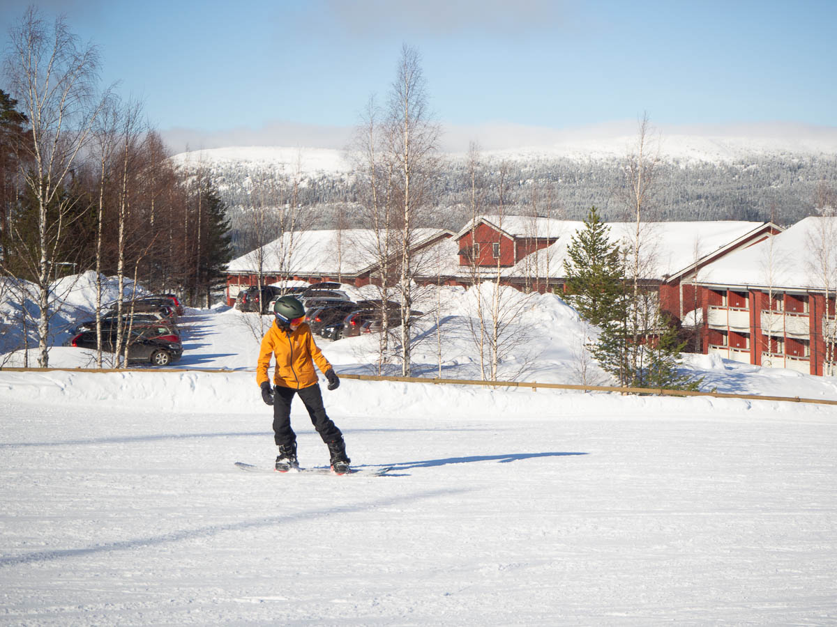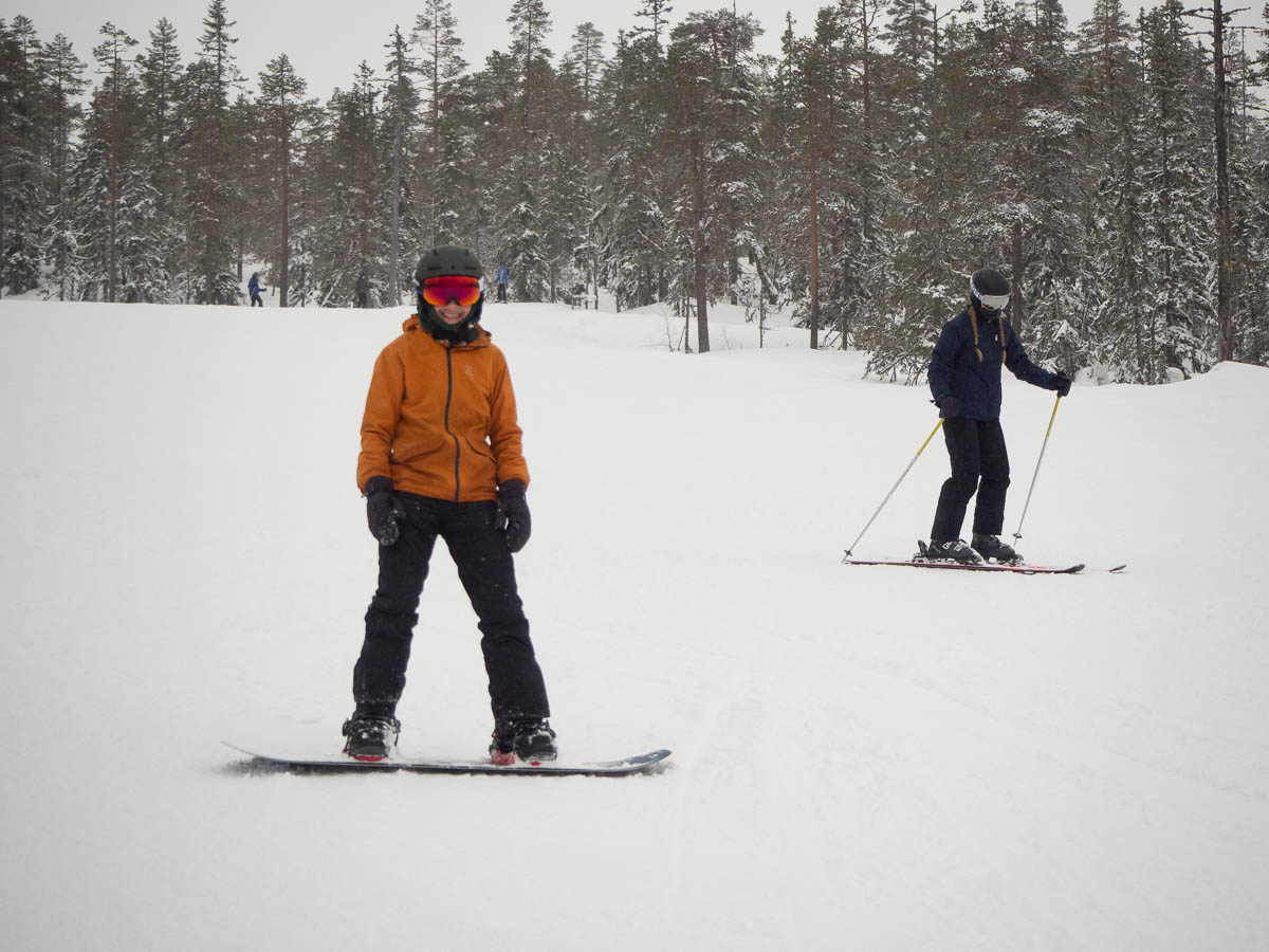 Anyway, he was feeling confident enough that he and Eric also got onto blue slopes. The longest slope here in Stöten, “Mormors störtlopp”, is green and gentle one, and very nice if you want an easy and relaxed ride – as a skier. But the topmost bit is a long, flat, narrow section that is not at all good for snowboarders. Ingrid and I have had plenty of time to explore the pistes, and found a blue run that we thought would fit the snowboarders’ needs as well. So we could all go down together, for the first time this trip. Which was nice – and gave me great photo opportunities.