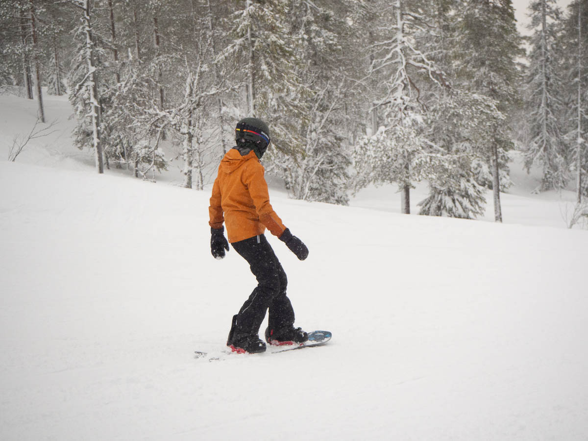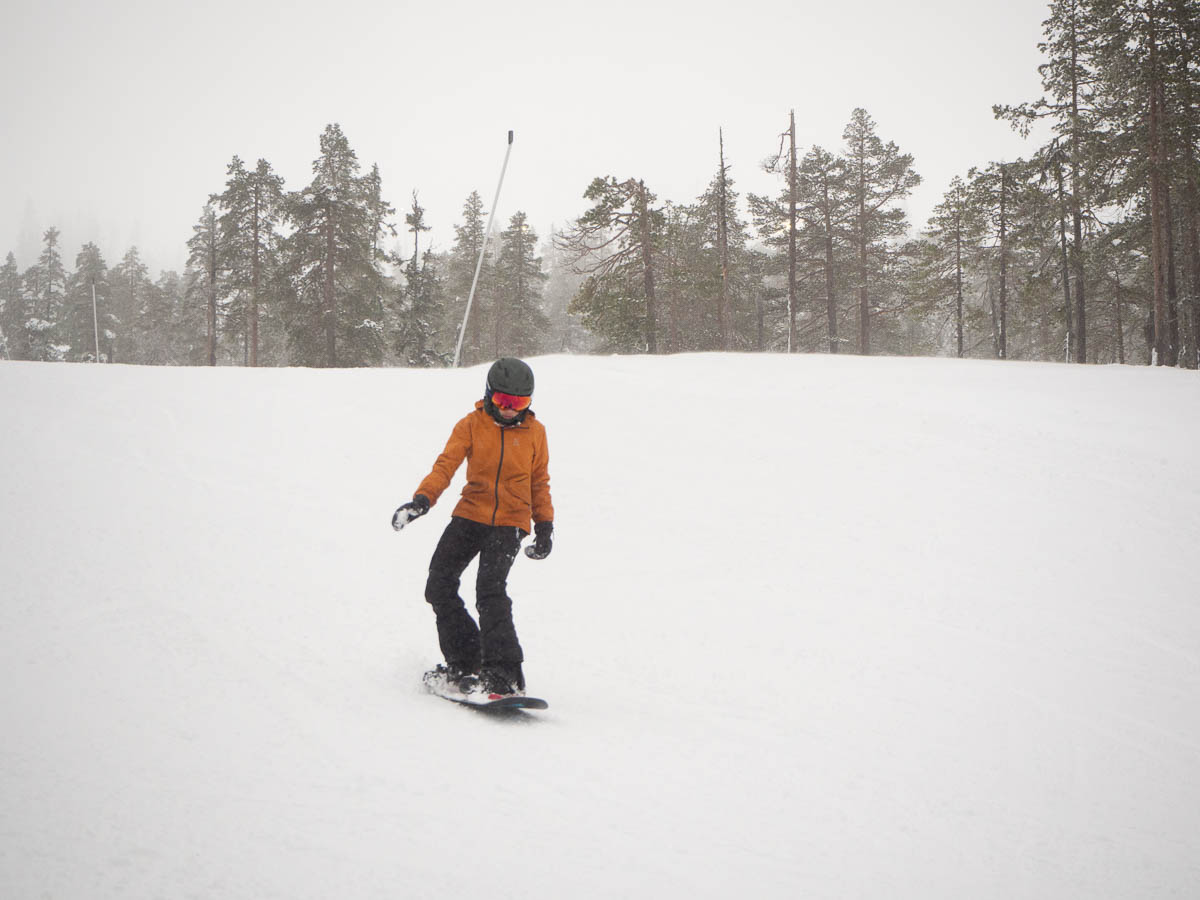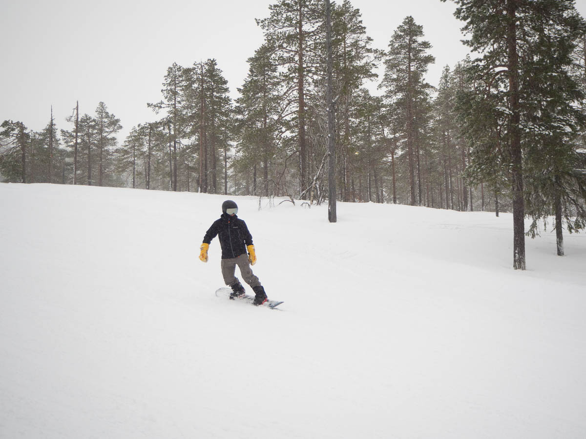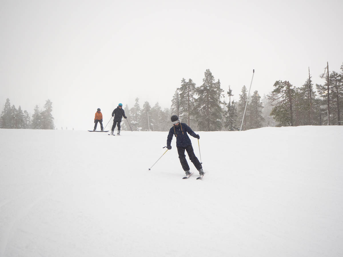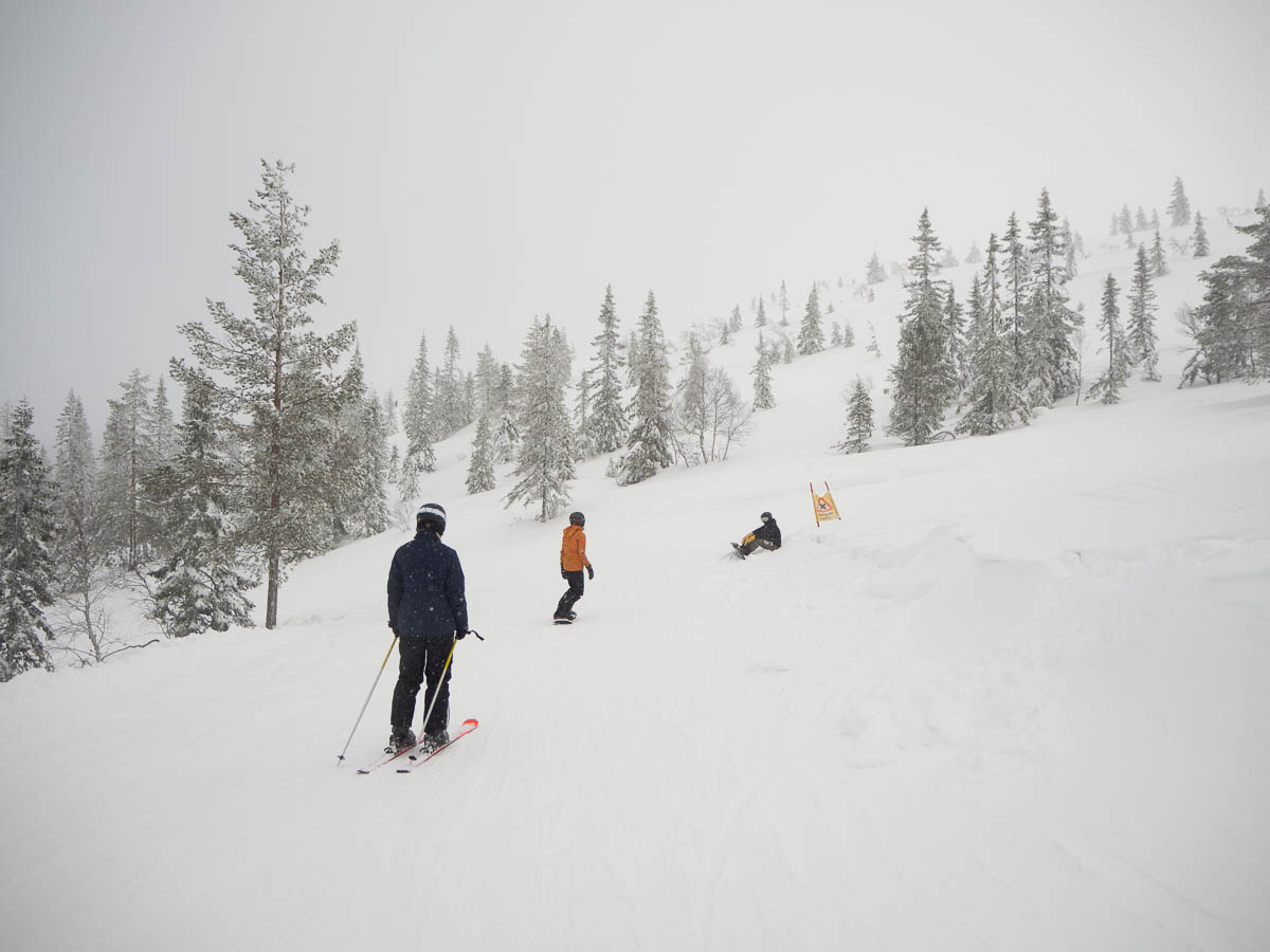 Anyway, he was feeling confident enough that he and Eric also got onto blue slopes. The longest slope here in Stöten, “Mormors störtlopp”, is green and gentle one, and very nice if you want an easy and relaxed ride – as a skier. But the topmost bit is a long, flat, narrow section that is not at all good for snowboarders. Ingrid and I have had plenty of time to explore the pistes, and found a blue run that we thought would fit the snowboarders’ needs as well. So we could all go down together, for the first time this trip. Which was nice – and gave me great photo opportunities.