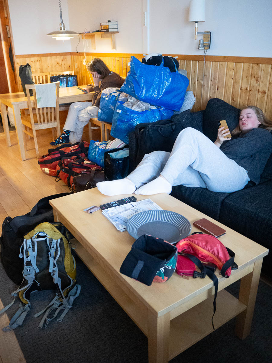 Off for a half-week of skiing in Stöten. Today was mostly a day of driving, and then getting ourselves situated, picking up our skis, etc. I forgot to take a photo, so I’m borrowing this one from tomorrow morning. This is our small apartment in Stöten – a small kitchen/living room combo, and two small bedrooms with bunk beds. It’s OK, for a few days, but with last year’s stay in Kläppen fresh in our memories, this doesn’t really compare. The sofa in particular is uncomfortable no matter how we try to sit in it. But! We’re no more 50 metres from the nearest piste, which is worth quite a bit.