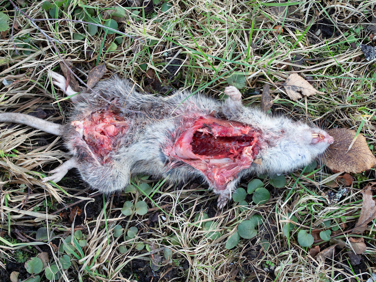 Someone killed a rat and got interrupted before eating it. Or perhaps they only wanted the best bits, that is, its heart and lungs? In any case, they left the rest of it in our garden.