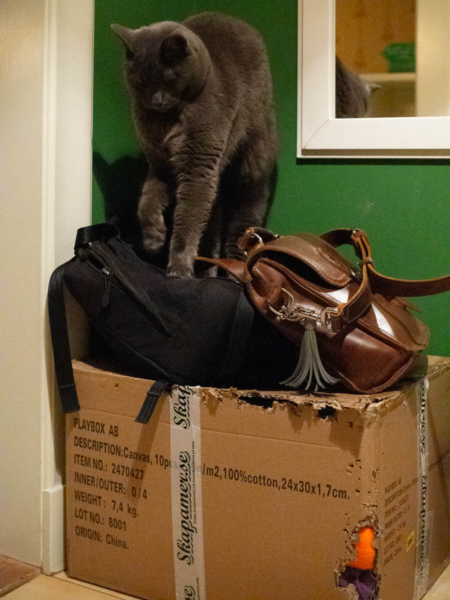I almost got a photo of Nysse sleeping on top of Eric’s computer bag, which I believe is the least comfortable thing I’ve ever seen him sleep on. (Disregarding those that seem uncomfortable only because they are hard, but since he weighs so little, they probably don’t feel very hard to him.) But he woke up just as I was adjusting the white balance.